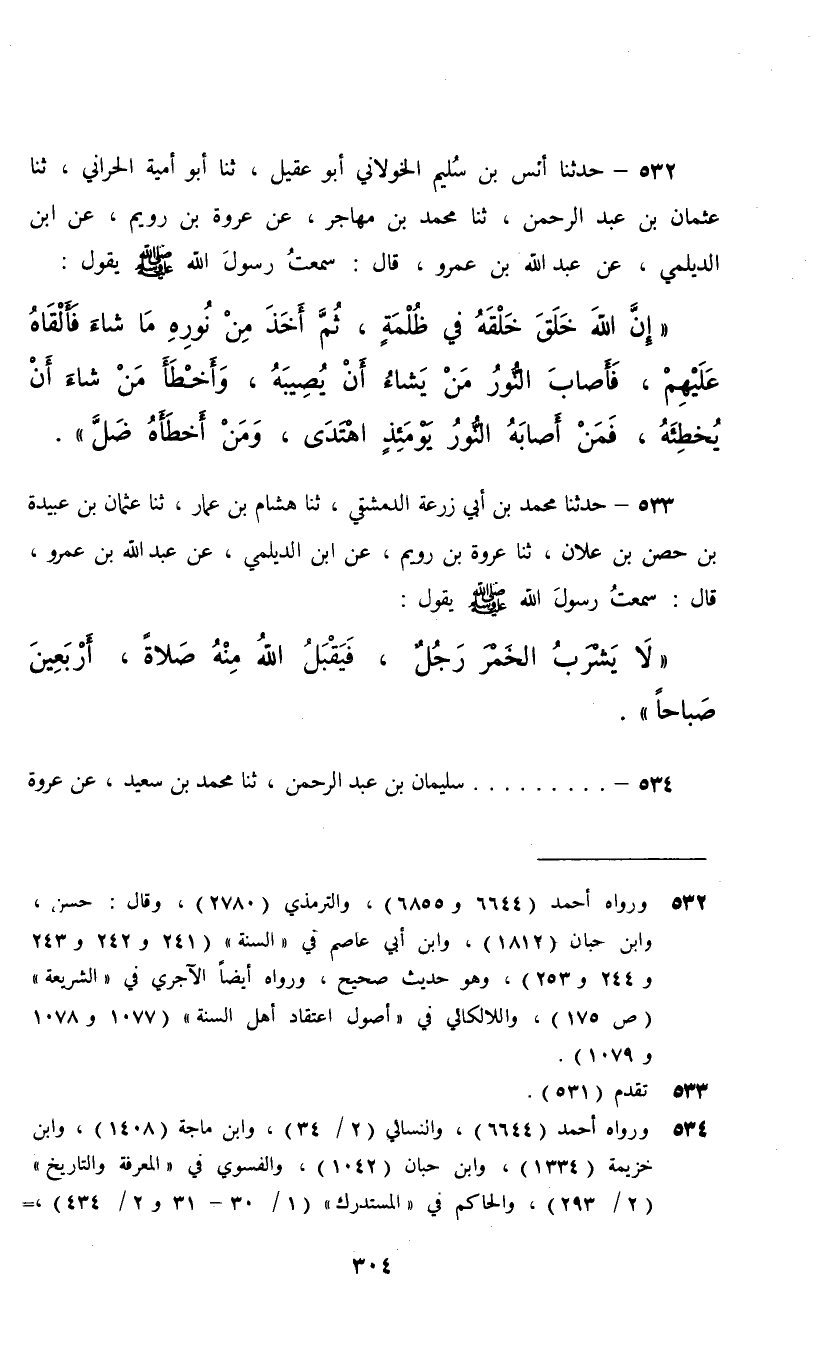532 - حَدَّثَنَا أَنَسُ بْنُ سُلَيْمٍ الْخَوْلَانِيُّ أَبُو عَقِيلٍ، ثنا أَبُو أُمَيَّةَ الْحَرَّانِيُّ، ثنا عُثْمَانُ بْنُ عَبْدِ الرَّحْمَنِ، ثنا مُحَمَّدُ بْنُ مُهَاجِرٍ، عَنْ عُرْوَةَ بْنِ رُوَيْمٍ , عَنِ ابْنِ الدَّيْلَمِيِّ، عَنْ عَبْدِ اللَّهِ بْنِ عَمْرٍو، قَالَ: سَمِعْتُ رَسُولَ اللَّهِ صَلَّى اللهُ عَلَيْهِ وَسَلَّمَ: يَقُولُ «إِنَّ §اللَّهَ خَلَقَ خَلْقَهُ فِي ظُلْمَةٍ , ثُمَّ أَخَذَ مِنْ نُورِهِ مَا شَاءَ فَأَلْقَاهُ عَلَيْهِمْ , فَأَصَابَ النُّورُ مَنْ يَشَاءُ أَنْ يُصِيبَهُ وَأَخْطَأَ مَنْ شَاءَ أَنْ يُخْطِئَهُ , فَمَنْ أَصَابَهُ النُّورُ يَوْمَئِذٍ اهْتَدَى وَمَنْ أَخْطَأَهُ ضَلَّ»