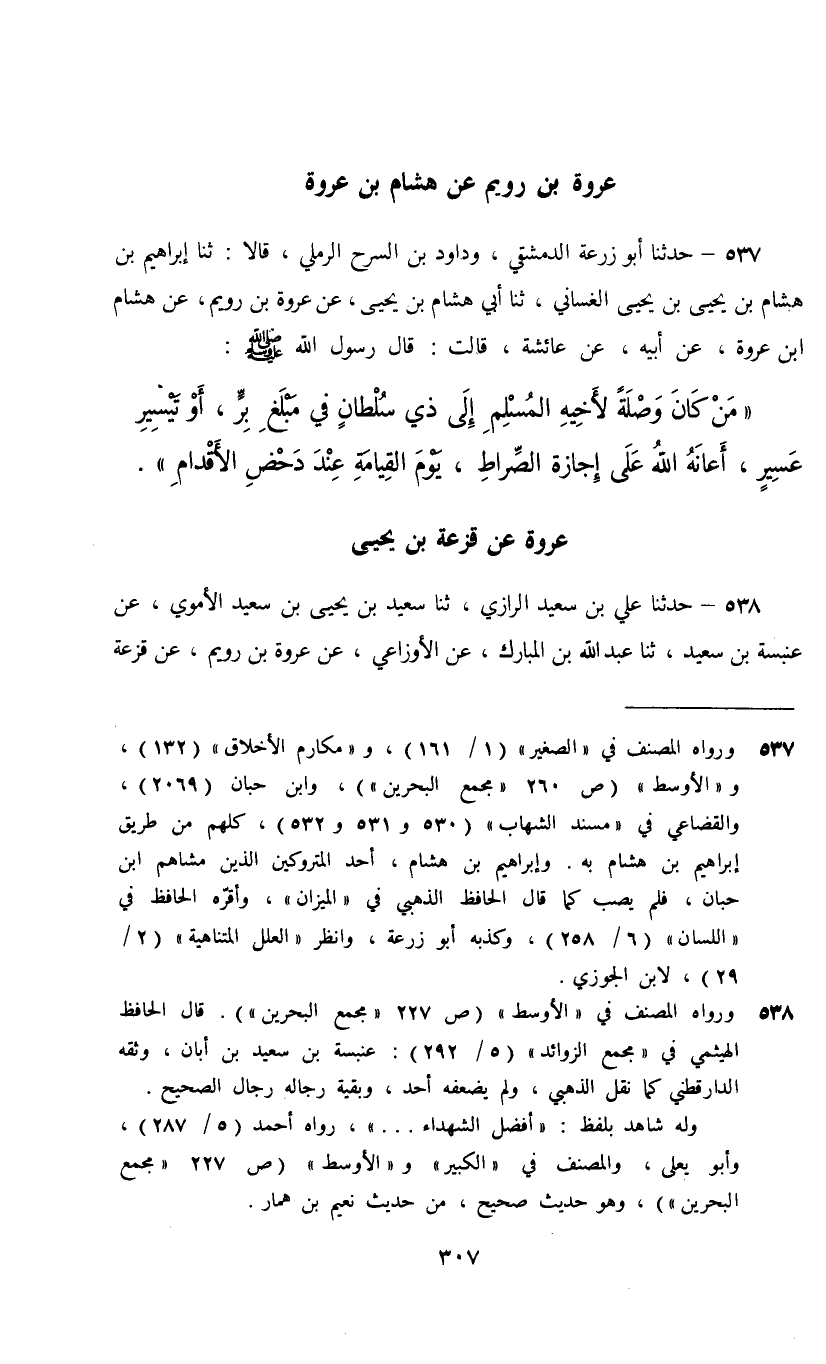 537 - حَدَّثَنَا أَبُو زُرْعَةَ الدِّمَشْقِيُّ، وَدَاوُدُ بْنُ السَّرْحِ الرَّمْلِيُّ , قَالَا: ثنا إِبْرَاهِيمُ بْنُ هِشَامِ بْنِ يَحْيَى بْنِ يَحْيَى الْغَسَّانِيُّ، ثنا أَبِي هِشَامِ بْنُ يَحْيَى، عَنْ عُرْوَةَ بْنِ رُوَيْمٍ , عَنْ هِشَامِ بْنِ عُرْوَةَ، عَنْ أَبِيهِ، عَنْ عَائِشَةَ، قَالَتْ: قَالَ رَسُولُ اللَّهِ صَلَّى اللهُ عَلَيْهِ وَسَلَّمَ: §«مَنْ كَانَ وَصْلَةً لِأَخِيهِ الْمُسْلِمِ إِلَى ذِي سُلْطَانٍ فِي مَبْلَغِ بِرٍّ أَوْ تَيْسِيرِ عَسِيرٍ أَعَانَهُ اللَّهُ عَلَى إِجَازَةِ الصِّرَاطِ يَوْمَ الْقِيَامَةِ عِنْدَ دَحْضِ الْأَقْدَامِ»