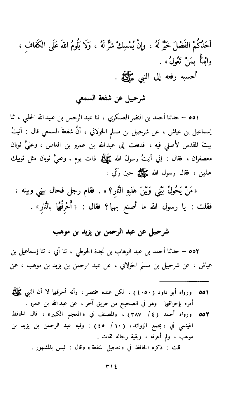 551 - حَدَّثَنَا أَحْمَدُ بْنُ النَّضْرِ الْعَسْكَرِيُّ، ثنا عَبْدُ الرَّحْمَنِ بْنُ عُبَيْدٍ الْحَلَبِيُّ، ثنا إِسْمَاعِيلُ بْنُ عَيَّاشٍ، عَنْ شُرَحْبِيلَ بْنِ مُسْلِمٍ الْخَوْلَانِيِّ، أَنَّ شُفْعَةَ السِّمْعِيَّ، قَالَ: أَتَيْتُ بَيْتَ الْمَقْدِسِ لِأُصَلِّيَ فِيهِ , فَدَفَعْتُ إِلَى عَبْدِ اللَّهِ بْنِ عَمْرِو بْنِ الْعَاصِ , وَعَلَيَّ ثَوْبَانِ مُعَصْفَرَانِ فَقَالَ: إِنِّي أَتَيْتُ رَسُولَ اللَّهِ صَلَّى اللهُ عَلَيْهِ وَسَلَّمَ ذَاتَ يَوْمٍ وَعَلَيَّ ثَوْبَانِ مِثْلُ ثَوْبَيْكَ هَذَيْنِ , فَقَالَ رَسُولُ اللَّهِ صَلَّى اللهُ عَلَيْهِ وَسَلَّمَ حِينَ رَآنِي: §«مَنْ يَحُولُ بَيْنِي وَبَيْنَ هَذِهِ النَّارِ؟» فَقَامَ رَجُلٌ فَحَالَ بَيْنِي وَبَيْنَهُ فَقُلْتُ: يَا رَسُولَ اللَّهِ مَا أَصْنَعُ بِهِمَا؟ فَقَالَ: «أَحْرِقْهُمَا بِالنَّارِ»