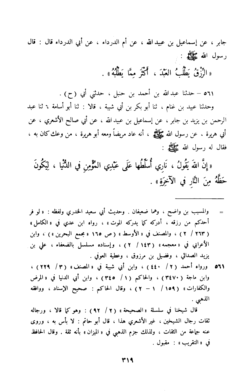 561 - حَدَّثَنَا عَبْدُ اللَّهِ بْنُ أَحْمَدَ بْنِ حَنْبَلٍ، حَدَّثَنِي أَبِي ح، وَحَدَّثَنَا عُبَيْدُ بْنُ غَنَّامٍ، ثنا أَبُو بَكْرِ بْنُ أَبِي شَيْبَةَ، قَالَا: ثنا أَبُو أُسَامَةَ، ثنا عَبْدُ الرَّحْمَنِ بْنُ يَزِيدَ بْنِ جَابِرٍ، عَنْ إِسْمَاعِيلَ بْنِ عُبَيْدِ اللَّهِ، عَنْ أَبِي صَالِحٍ الْأَشْعَرِيِّ، عَنْ أَبِي هُرَيْرَةَ، عَنْ رَسُولِ اللَّهِ صَلَّى اللهُ عَلَيْهِ وَسَلَّمَ: أَنَّهُ عَادَ مَرِيضًا وَمَعَهُ أَبُو هُرَيْرَةَ مِنْ وَعْكٍ كَانَ بِهِ فَقَالَ لَهُ رَسُولُ اللَّهِ صَلَّى اللهُ عَلَيْهِ وَسَلَّمَ: " إِنَّ اللَّهَ يَقُولُ: §«نَارِي أُسَلِّطُهَا عَلَى عَبْدِي الْمُؤْمِنِ فِي الدُّنْيَا , لِيَكُونَ حَظُّهُ مِنَ النَّارِ فِي الْآخِرَةِ»