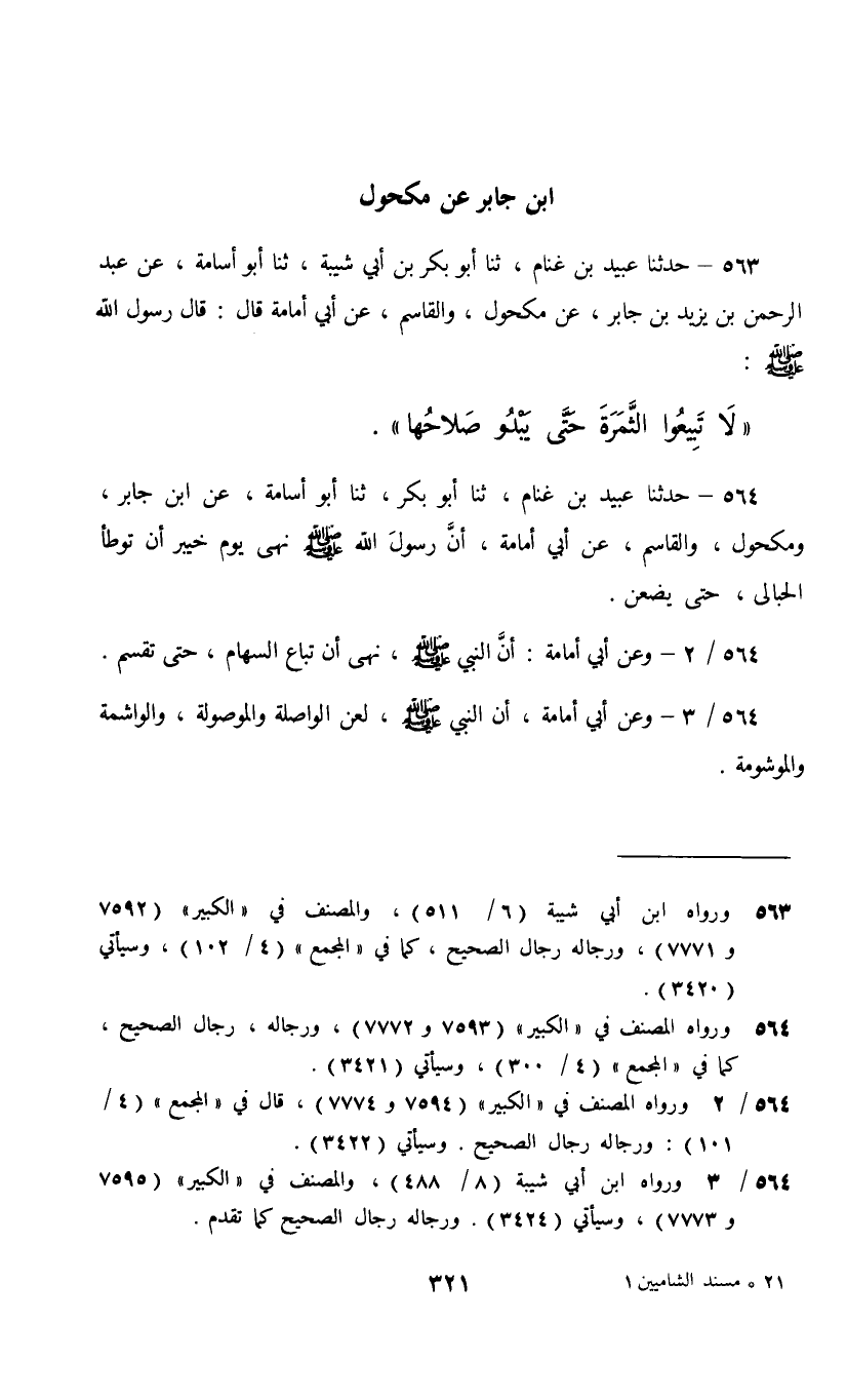 563 - حَدَّثَنَا عُبَيْدُ بْنُ غَنَّامٍ، ثنا أَبُو بَكْرِ بْنُ أَبِي شَيْبَةَ، ثنا أَبُو أُسَامَةَ، عَنْ عَبْدِ الرَّحْمَنِ بْنِ يَزِيدَ بْنِ جَابِرٍ، عَنْ مَكْحُولٍ، وَالْقَاسِمِ عَنْ أَبِي أُمَامَةَ، قَالَ: قَالَ رَسُولُ اللَّهِ صَلَّى اللهُ عَلَيْهِ وَسَلَّمَ: §«لَا تَبِيعُوا الثَّمَرَةَ حَتَّى يَبْدُو صَلَاحُهَا»