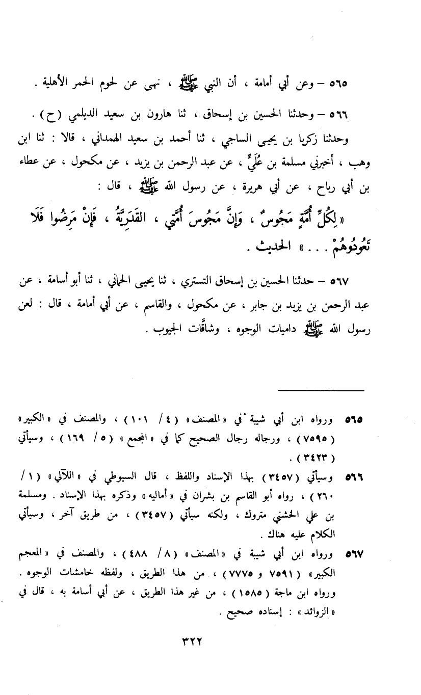 566 - وَحَدَّثَنَا الْحُسَيْنُ بْنُ إِسْحَاقَ، ثنا هَارُونُ بْنُ سَعِيدٍ الدَّيْلَمِيُّ، ح , وَحَدَّثَنَا زَكَرِيَّا بْنُ يَحْيَى السَّاجِيُّ، ثنا أَحْمَدُ بْنُ سَعِيدٍ الْهَمْدَانِيُّ، قَالَا: ثنا ابْنُ وَهْبٍ، أَخْبَرَنِي مَسْلَمَةُ بْنُ عُلَيٍّ، عَنْ عَبْدِ الرَّحْمَنِ بْنِ يَزِيدَ، عَنْ مَكْحُولٍ، عَنْ عَطَاءِ بْنِ أَبِي رَبَاحٍ، عَنْ أَبِي هُرَيْرَةَ، عَنْ رَسُولِ اللَّهِ صَلَّى اللهُ عَلَيْهِ وَسَلَّمَ قَالَ: §«لِكُلِّ أُمَّةٍ مَجُوسٌ , وَإِنَّ مَجُوسَ أُمَّتِي الْقَدَرِيَّةُ , فَإِنْ مَرِضُوا فَلَا تَعُودُوهُمْ» الْحَدِيثُ