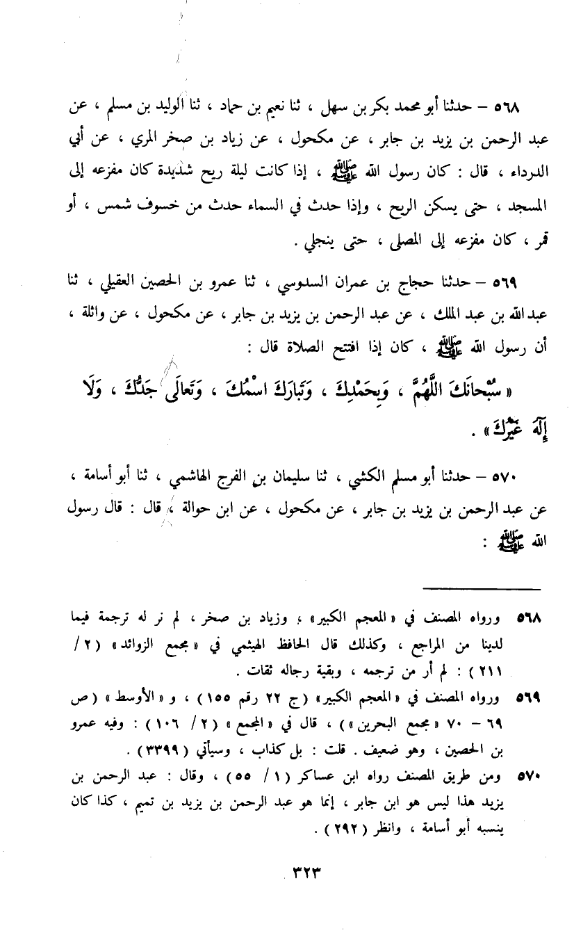 569 - حَدَّثَنَا حَجَّاجُ بْنُ عِمْرَانَ السَّدُوسِيُّ، ثنا عَمْرُو بْنُ الْحُصَيْنِ الْعُقَيْلِيُّ، ثنا عَبْدُ اللَّهِ بْنُ عَبْدِ الْمَلِكِ، عَنْ عَبْدِ الرَّحْمَنِ بْنِ يَزِيدَ بْنِ جَابِرٍ، عَنْ مَكْحُولٍ، عَنْ وَاثِلَةَ، أَنَّ رَسُولَ اللَّهِ صَلَّى اللهُ عَلَيْهِ وَسَلَّمَ كَانَ §إِذَا افْتَتَحَ الصَّلَاةَ قَالَ: «سُبْحَانَكَ اللَّهُمَّ وَبِحَمْدِكَ , وَتَبَارَكَ اسْمُكَ , وَتَعَالَى جَدُّكَ , وَلَا إِلَهَ غَيْرُكَ»