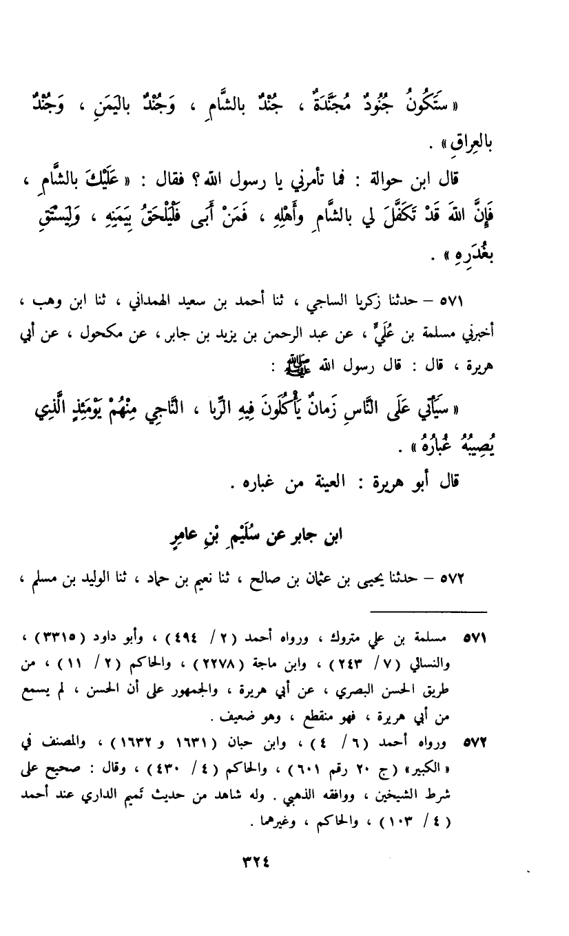 571 - حَدَّثَنَا زَكَرِيَّا السَّاجِيُّ، ثنا أَحْمَدُ بْنُ سَعِيدٍ الْهَمْدَانِيُّ، ثنا ابْنُ وَهْبٍ، أَخْبَرَنِي مَسْلَمَةُ بْنُ عُلَيٍّ، عَنْ عَبْدِ الرَّحْمَنِ بْنِ يَزِيدَ بْنِ جَابِرٍ، عَنْ مَكْحُولٍ، عَنْ أَبِي هُرَيْرَةَ، قَالَ: قَالَ رَسُولُ اللَّهِ صَلَّى اللهُ عَلَيْهِ وَسَلَّمَ: §«سَيَأْتِي عَلَى النَّاسِ زَمَانٌ يَأْكُلُونَ فِيهِ الرِّبَا , النَّاجِي مِنْهُمْ يَوْمَئِذٍ الَّذِي يُصِيبُهُ غُبَارُهُ» قَالَ أَبُو هُرَيْرَةَ: الْعِينَةُ مِنْ غُبَارِهِ