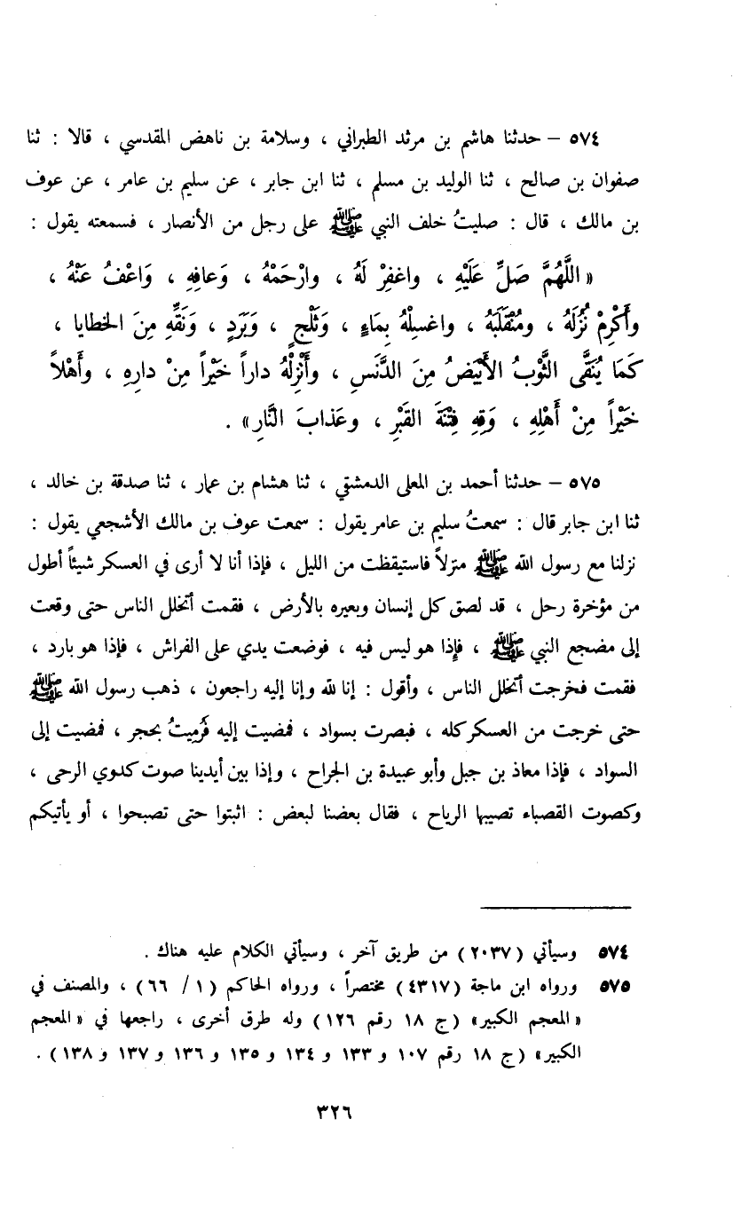 574 - حَدَّثَنَا هَاشِمُ بْنُ مَرْثَدٍ الطَّبَرَانِيُّ، وَسَلَامَةُ بْنُ نَاهِضٍ الْمَقْدِسِيُّ , قَالَا: ثنا صَفْوَانُ بْنُ صَالِحٍ، ثنا الْوَلِيدُ بْنُ مُسْلِمٍ، ثنا ابْنُ جَابِرٍ، عَنْ سُلَيْمِ بْنِ عَامِرٍ، عَنْ عَوْفِ بْنِ مَالِكٍ، قَالَ: " صَلَّيْتُ خَلْفَ النَّبِيِّ صَلَّى اللهُ عَلَيْهِ وَسَلَّمَ عَلَى رَجُلٍ مِنَ الْأَنْصَارِ فَسَمِعْتُهُ يَقُولُ: §" اللَّهُمَّ صَلِّ عَلَيْهِ , وَاغْفِرْ لَهُ , وَارْحَمْهُ , وَعَافِهِ وَاعْفُ عَنْهُ , وَأَكْرِمْ نُزُلَهُ , وَمُنْقَلَبَهُ وَاغْسِلْهُ بِمَاءٍ وَثَلْجٍ وَبَرَدٍ وَنَقِّهِ مِنَ الْخَطَايَا كَمَا يُنَقَّى الثَّوْبُ الْأَبْيَضُ مِنَ الدَّنَسِ , وَأَنْزِلْهُ دَارًا خَيْرًا مِنْ دَارِهِ , وَأَهْلًا خَيْرًا مِنْ أَهْلِهِ , وَقِهِ فِتْنَةَ الْقَبْرِ , وَعَذَابَ النَّارِ