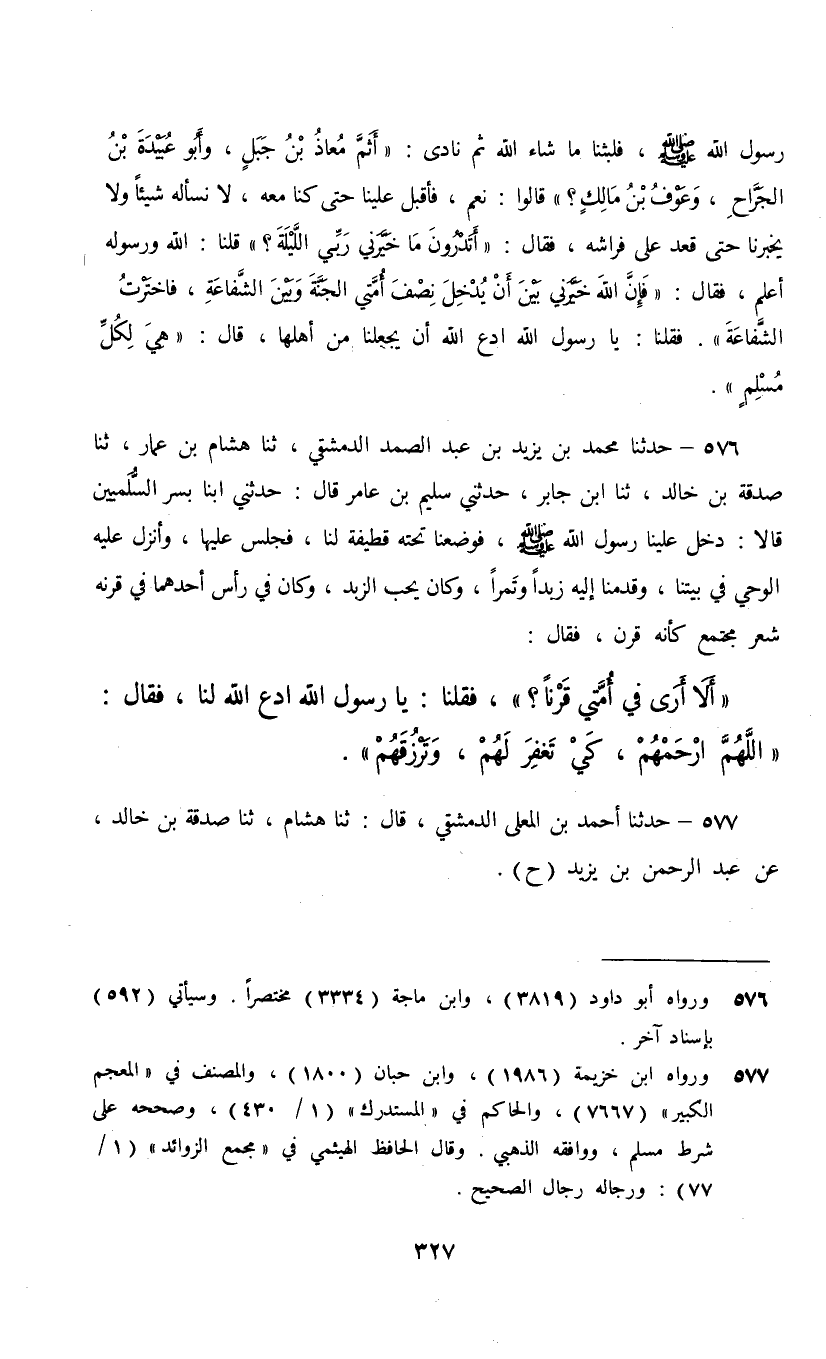 576 - حَدَّثَنَا مُحَمَّدُ بْنُ يَزِيدَ بْنِ عَبْدِ الصَّمَدِ الدِّمَشْقِيُّ، ثنا هِشَامُ بْنُ عَمَّارٍ، ثنا صَدَقَةُ بْنُ خَالِدٍ، ثنا ابْنُ جَابِرٍ، حَدَّثَنِي سُلَيْمُ بْنُ عَامِرٍ، قَالَ: حَدَّثَنِي ابْنَا بُسْرٍ السُّلَمِيَّيْنِ , قَالَا: دَخَلَ عَلَيْنَا رَسُولُ اللَّهِ صَلَّى اللهُ عَلَيْهِ وَسَلَّمَ فَوَضَعْنَا تَحْتَهُ قَطِيفَةً لَنَا , فَجَلَسَ عَلَيْهَا وَأُنْزِلَ عَلَيْهِ الْوَحْي فِي بَيْتِنَا , وَقَدَّمْنَا إِلَيْهِ زُبْدًا وَتَمْرًا وَكَانَ يُحِبُّ الزُّبْدَ , وَكَانَ فِي رَأْسِ أَحَدِهِمَا فِي قَرْنِهِ شَعَرٌ مُجْتَمِعٌ كَأَنَّهُ قَرْنٌ , فَقَالَ: «§أَلَا أَرَى فِي أُمَّتِي قَرْنًا» فَقُلْنَا: يَا رَسُولَ اللَّهِ ادْعُ اللَّهَ لَنَا فَقَالَ: «اللَّهُمَّ ارْحَمْهُمْ كَيْ تَغْفِرَ لَهُمْ وَتَرْزُقَهُمْ»