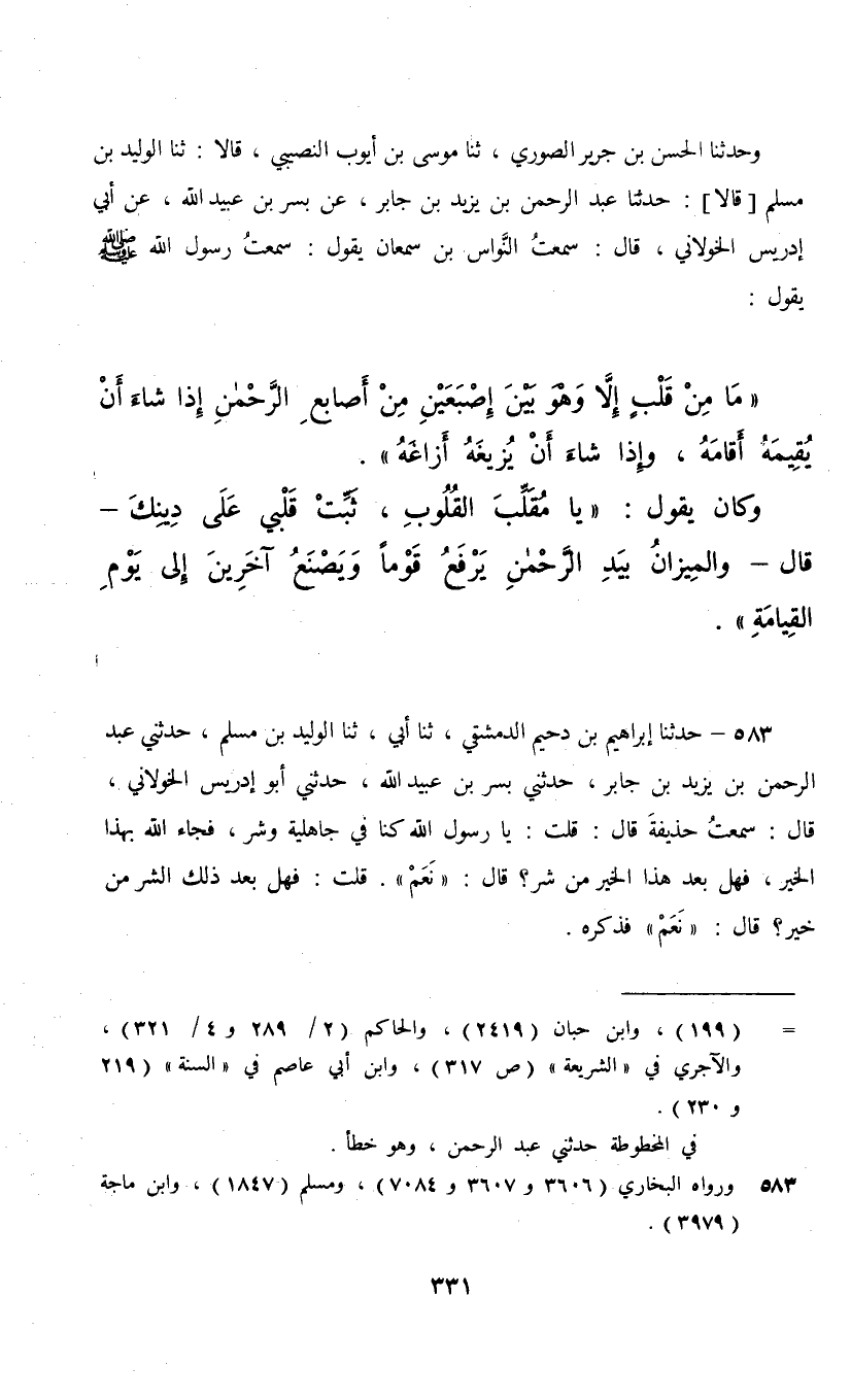 583 - حَدَّثَنَا إِبْرَاهِيمُ بْنُ دُحَيْمٍ الدِّمَشْقِيُّ، ثنا أَبِي، ثنا الْوَلِيدُ بْنُ مُسْلِمٍ، حَدَّثَنِي عَبْدُ الرَّحْمَنِ بْنُ يَزِيدَ بْنِ جَابِرٍ، حَدَّثَنِي بُسْرُ بْنُ عُبَيْدِ اللَّهِ، حَدَّثَنِي أَبُو إِدْرِيسَ الْخَوْلَانِيُّ، قَالَ: سَمِعْتُ حُذَيْفَةَ، قَالَ: قُلْتُ: يَا رَسُولَ اللَّهِ كُنَّا فِي جَاهِلِيَّةٍ وَشَرٍّ , فَجَاءَ اللَّهُ بِهَذَا الْخَيْرِ §فَهَلْ بَعْدَ هَذَا الْخَيْرِ مِنْ شَرٍّ؟ قَالَ: «نَعَمْ» قُلْتَ: فَهَلْ بَعْدَ ذَلِكَ الشَّرِّ مِنْ خَيْرٍ؟ قَالَ: «نَعَمْ» فَذَكَرَهُ
