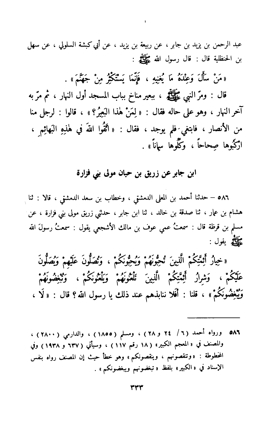 586 - حَدَّثَنَا أَحْمَدُ بْنُ الْمُعَلَّى الدِّمَشْقِيُّ، وَخَطَّابُ بْنُ سَعْدٍ الدِّمَشْقِيُّ , قَالَا: ثنا هِشَامُ بْنُ عَمَّارٍ، ثنا صَدَقَةُ بْنُ خَالِدٍ، ثنا ابْنُ جَابِرٍ، حَدَّثَنِي رُزَيْقُ، مَوْلَى بَنِي فَزَارَةَ , عَنْ مُسْلِمِ بْنِ قَرَظَةَ، قَالَ: سَمِعْتُ عَمِّيَ، عَوْفَ بْنَ مَالِكٍ الْأَشْجَعِيَّ يَقُولُ: سَمِعْتُ رَسُولَ اللَّهِ صَلَّى اللهُ عَلَيْهِ وَسَلَّمَ يَقُولُ: §«خِيَارُ أَئِمَّتِكُمُ الَّذِينَ تُحِبُّونَهُمْ وَيُحِبُّونَكُمْ , وَتُصَلُّونَ عَلَيْهِمْ وَيُصَلُّونَ عَلَيْكُمْ , وَشِرَارُ أَئِمَّتِكُمُ الَّذِينَ تَلْعَنُونَهُمْ وَيَلْعَنُونَكُمْ وَتَبْغِضُونَهُمْ وَيُبْغِضُونَكُمْ» قُلْنَا: أَفَلَا نُنَابِذُهُمْ عِنْدَ ذَلِكَ يَا رَسُولَ اللَّهِ؟ قَالَ: «لَا مَا أَقَامُوا فِيكُمُ الصَّلَاةَ , أَلَا وَمَنْ وُلِّيَ عَلَيْهِ وَالٍ فَرَآهُ يَأْتِي شَيْئًا مِنْ مَعْصِيَةِ اللَّهِ فَلْيَكْرَهْ مَا رَأَى مِنْ مَعْصِيَةِ اللَّهِ وَلَا يَنْزِعَنَّ يَدًا مِنْ طَاعَةٍ»