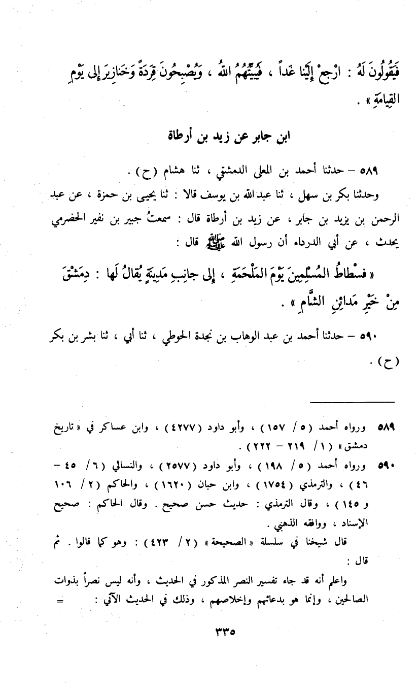 589 - حَدَّثَنَا أَحْمَدُ بْنُ الْمُعَلَّى الدِّمَشْقِيُّ، ثنا هِشَامُ، ح , وَحَدَّثَنَا بَكْرُ بْنُ سَهْلٍ، ثنا عَبْدُ اللَّهِ بْنُ يُوسُفَ، قَالَا: ثنا يَحْيَى بْنُ حَمْزَةَ، عَنْ عَبْدِ الرَّحْمَنِ بْنِ يَزِيدَ بْنِ جَابِرٍ، عَنْ زَيْدِ بْنِ أَرْطَاةَ، قَالَ: سَمِعْتُ جُبَيْرَ بْنَ نُفَيْرٍ الْحَضْرَمِيَّ، يُحَدِّثُ عَنْ أَبِي الدَّرْدَاءِ، أَنَّ رَسُولَ اللَّهِ صَلَّى اللهُ عَلَيْهِ وَسَلَّمَ قَالَ: " §فُسْطَاطُ الْمُسْلِمِينَ يَوْمَ الْمَلْحَمَةِ إِلَى جَانِبِ مَدِينَةٍ يُقَالُ لَهَا: دِمَشْقُ مِنْ خَيْرِ مَدَائِنِ الشَّامِ "
