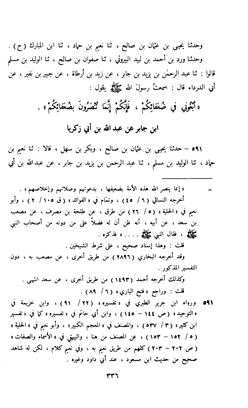 591 - حَدَّثَنَا يَحْيَى بْنُ عُثْمَانَ بْنِ صَالِحٍ، وَبَكْرُ بْنُ سَهْلٍ قَالَا: ثنا نُعَيْمُ بْنُ حَمَّادٍ، ثنا الْوَلِيدُ بْنُ مُسْلِمٍ، ثنا عَبْدُ الرَّحْمَنِ بْنُ يَزِيدَ بْنِ جَابِرٍ، عَنْ عَبْدِ اللَّهِ بْنِ أَبِي زَكَرِيَّا، عَنْ رَجَاءِ بْنِ حَيْوَةَ، عَنِ النَّوَّاسِ بْنِ سَمْعَانَ، قَالَ: سَمِعْتُ رَسُولَ اللَّهِ صَلَّى اللهُ عَلَيْهِ وَسَلَّمَ يَقُولُ: " إِنَّ §اللَّهَ إِذَا أَرَادَ أَنْ يَأْمُرَ بِأَمْرٍ تَكَلَّمَ بِهِ , فَإِذَا تَكَلَّمَ بِهِ أَخَذْتِ السَّمَاءَ رَجْفَةٌ أَوْ قَالَ رِعْدَةٌ شَدِيدَةٌ , فَإِذَا سَمِعَ بِذَلِكَ أَهْلُ السَّمَاءِ صُعِقُوا فَيَخِرُّونَ سُجَّدًا , فَيَكُونُ أَوَّلَ مَنْ يَرْفَعُ رَأْسَهُ جِبْرِيلُ عَلَيْهِ السَّلَامُ , فَيُكَلِّمُهُ اللَّهُ مِنْ وَحْيِهِ بِمَا أَرَادَ , فَيَمُرُّ بِهِ جِبْرِيلُ عَلَى الْمَلَائِكَةِ , فَكُلَّمَا مَرَّ بِسَمَاءٍ سَأَلَتْهُ مَلَائِكَتُهَا مَاذَا قَالَ رَبُّنَا؟ قَالَ: قَالَ جِبْرِيلُ عَلَيْهِ السَّلَامُ: قَالَ رَبُّكُمُ الْحَقَّ وَهُوَ الْعَلِيُّ الْكَبِيرُ , فَيَقُولُونَ كُلُّهُمْ كَمَا قَالَ جِبْرِيلُ عَلَيْهِ السَّلَامُ فَيَنْتَهِي جِبْرِيلُ بِالْوَحْي حَيْثُ أُمِرَ منْ سَمَاءٍ وَأَرْضٍ "