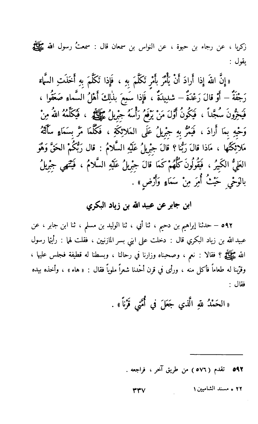 592 - حَدَّثَنَا إِبْرَاهِيمُ بْنُ دُحَيْمٍ، ثنا أَبِي، ثنا الْوَلِيدُ بْنُ مُسْلِمٍ، ثنا ابْنُ جَابِرٍ، عَنْ عُبَيْدِ اللَّهِ بْنِ زِيَادٍ الْبَكْرِيِّ، قَالَ: دَخَلْتُ عَلَى ابْنِي بُسْرٍ الْمَازِنِيَّيْنِ , فَقُلْتُ لَهُمَا: رَأَيْتُمَا رَسُولَ اللَّهِ صَلَّى اللهُ عَلَيْهِ وَسَلَّمَ؟ فَقَالَا: نَعَمْ , وَصَحِبْنَاهُ وَزَارَنَا فِي رِحَالِنَا , وَبَسَطْنَا لَهُ قَطِيفَةً فَجَلَسَ عَلَيْهَا , وَقَرَّبْنَا لَهُ طَعَامًا فَأَكَلَ مِنْهُ وَرَأَى فِي قَرْنِ أَحَدِنَا شَعْرًا مَلْوِيًّا , فَقَالَ: «هَاءَ» وَأَخَذَهُ بِيَدِهِ فَقَالَ: §«الْحَمْدُ لِلَّهِ الَّذِي جَعَلَ فِي أُمَّتِي قَرْنًا»