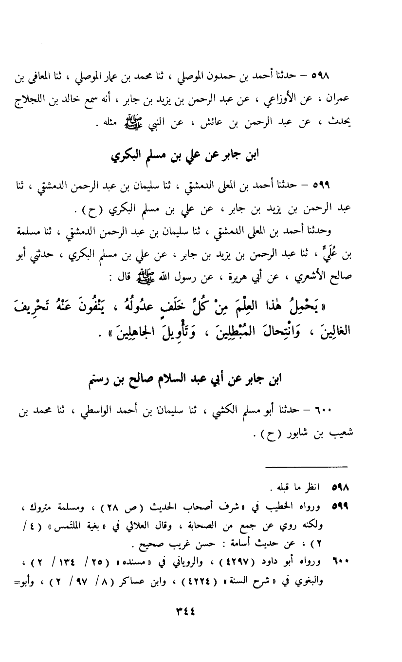 599 - حَدَّثَنَا أَحْمَدُ بْنُ الْمُعَلَّى الدِّمَشْقِيُّ، ثنا سُلَيْمَانُ بْنُ عَبْدِ الرَّحْمَنِ الدِّمَشْقِيُّ، ثنا عَبْدُ الرَّحْمَنِ بْنُ يَزِيدَ بْنِ جَابِرٍ، عَنْ عَلِيِّ بْنِ مُسْلِمٍ الْبَكْرِيِّ، ح , وَحَدَّثَنَا أَحْمَدُ بْنُ الْمُعَلَّى الدِّمَشْقِيُّ، ثنا سُلَيْمَانُ بْنُ عَبْدِ الرَّحْمَنِ الدِّمَشْقِيُّ، ثنا مَسْلَمَةُ بْنُ عُلَيٍّ، ثنا عَبْدُ الرَّحْمَنِ بْنُ يَزِيدَ بْنِ جَابِرٍ، عَنْ عَلِيِّ بْنِ مُسْلِمٍ الْبَكْرِيِّ، حَدَّثَنِي أَبُو صَالِحٍ الْأَشْعَرِيُّ، عَنْ أَبِي هُرَيْرَةَ، عَنْ رَسُولِ اللَّهِ صَلَّى اللهُ عَلَيْهِ وَسَلَّمَ قَالَ: §«يَحْمِلُ هَذَا الْعِلْمَ مِنْ كُلِّ خَلْفٍ عُدُولُهُ , يَنْفُونَ عَنْهُ تَحْرِيفَ الْغَالِينَ , وَانْتِحَالَ الْمُبْطِلِينَ , وَتَأْوِيلَ الْجَاهِلِينَ»