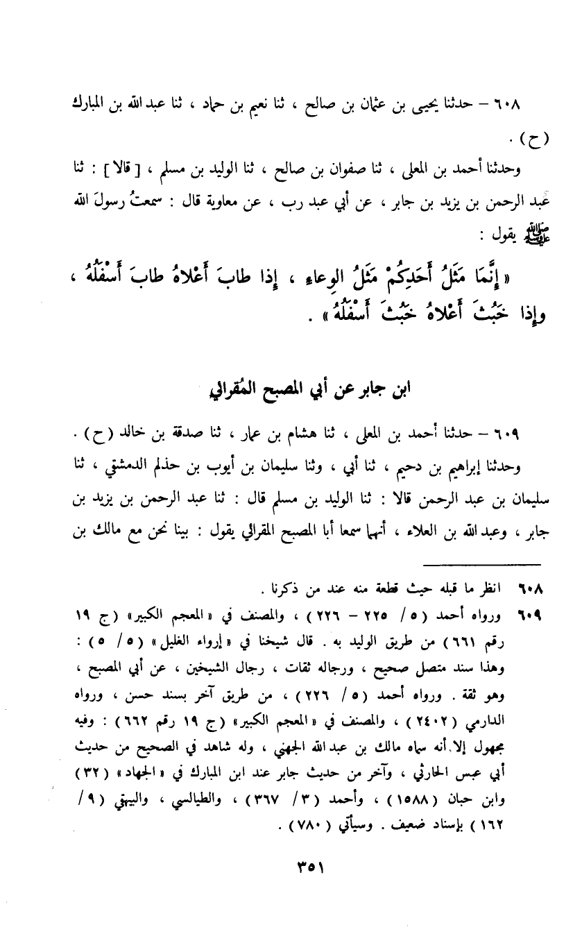 608 - حَدَّثَنَا يَحْيَى بْنُ عُثْمَانَ بْنِ صَالِحٍ، ثنا نُعَيْمُ بْنُ حَمَّادٍ، ثنا عَبْدُ اللَّهِ بْنُ الْمُبَارَكِ، ح , وَحَدَّثَنَا أَحْمَدُ بْنُ الْمُعَلَّى، ثنا صَفْوَانُ بْنُ صَالِحٍ، ثنا الْوَلِيدُ بْنُ مُسْلِمٍ، [قَالَا] : ثنا عَبْدُ الرَّحْمَنِ بْنُ يَزِيدَ بْنِ جَابِرٍ، عَنْ أَبِي عَبْدِ رَبٍّ، عَنْ مُعَاوِيَةَ، قَالَ: سَمِعْتُ رَسُولَ اللَّهِ صَلَّى اللهُ عَلَيْهِ وَسَلَّمَ يَقُولُ: إِنَّمَا §مَثَلُ أَحَدِكُمْ مَثَلُ الْوِعَاءِ إِذَا طَابَ أَعْلَاهُ طَابَ أَسْفَلُهُ وَإِذَا خَبُثَ أَعْلَاهُ خَبُثَ أَسْفَلُهُ "