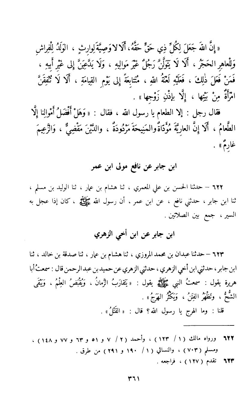 623 - حَدَّثَنَا عَبْدَانُ بْنُ مُحَمَّدٍ الْمَرْوَزِيُّ، ثنا هِشَامُ بْنُ عَمَّارٍ، ثنا صَدَقَةُ بْنُ خَالِدٍ، ثنا ابْنُ جَابِرٍ، حَدَّثَنِي ابْنُ أَخِي الزُّهْرِيِّ، حَدَّثَنِي الزُّهْرِيُّ، عَنْ حُمَيْدِ بْنِ عَبْدِ الرَّحْمَنِ، قَالَ: سَمِعْتُ أَبَا هُرَيْرَةَ، يَقُولُ: سَمِعْتُ النَّبِيَّ صَلَّى اللهُ عَلَيْهِ وَسَلَّمَ يَقُولُ: §«يَتَقَارَبُ الزَّمَانُ , وَيُقْبَضُ الْعِلْمُ , وَيَبْقَى الشُّحُّ وَتَظْهَرُ الْفِتَنُ وَيَكْثُرُ الْهَرْجُ» قُلْنَا: وَمَا الْهَرْجُ يَا رَسُولَ اللَّهِ؟ قَالَ: «الْقَتْلُ»