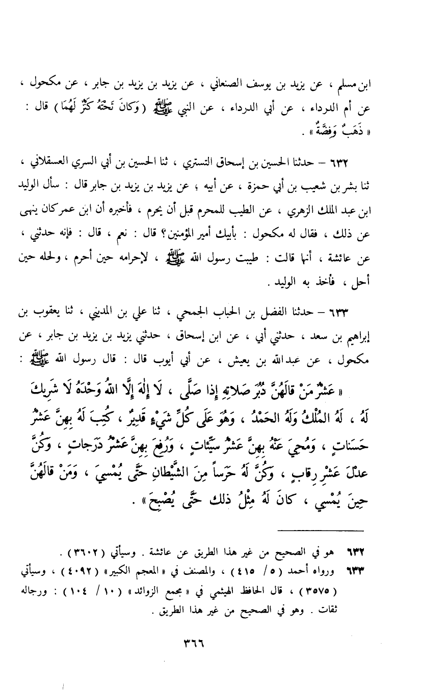 633 - حَدَّثَنَا الْفَضْلُ بْنُ الْحُبَابِ الْجُمَحِيُّ، ثنا عَلِيُّ بْنُ الْمَدِينِيِّ، ثنا يَعْقُوبُ بْنُ إِبْرَاهِيمَ بْنِ سَعْدٍ، حَدَّثَنِي أَبِي، عَنِ ابْنِ إِسْحَاقَ، حَدَّثَنِي يَزِيدُ بْنُ يَزِيدَ بْنِ جَابِرٍ، عَنْ مَكْحُولٍ، عَنْ عَبْدِ اللَّهِ بْنِ يَعِيشَ، عَنْ أَبِي أَيُّوبَ، قَالَ: قَالَ رَسُولُ اللَّهِ صَلَّى اللهُ عَلَيْهِ وَسَلَّمَ: §«عَشْرٌ مَنْ قَالَهُنَّ دُبُرَ صَلَاتِهِ إِذَا صَلَّى , لَا إِلَهَ إِلَّا اللَّهُ وَحْدَهُ لَا شَرِيكَ لَهُ , لَهُ الْمُلْكُ وَلَهُ الْحَمْدُ وَهُوَ عَلَى كُلِّ شَيْءٍ قَدِيرٌ , كُتِبَ لَهُ بِهِنَّ عَشْرُ حَسَنَاتٍ , وَمُحِيَ عَنْهُ بِهِنَّ عَشْرُ سَيِّئَاتٍ , وَرُفِعَ بِهِنَّ عَشْرُ دَرَجَاتٍ , وَكُنَّ عَدْلَ عَشْرِ رِقَابٍ , وَكُنَّ لَهُ حَرَسًا مِنَ الشَّيْطَانِ حَتَّى يُمْسِيَ , وَمَنْ قَالَهُنَّ حِينَ يُمْسِي كَانَ لَهُ مِثْلُ ذَلِكَ حَتَّى يُصْبِحَ»