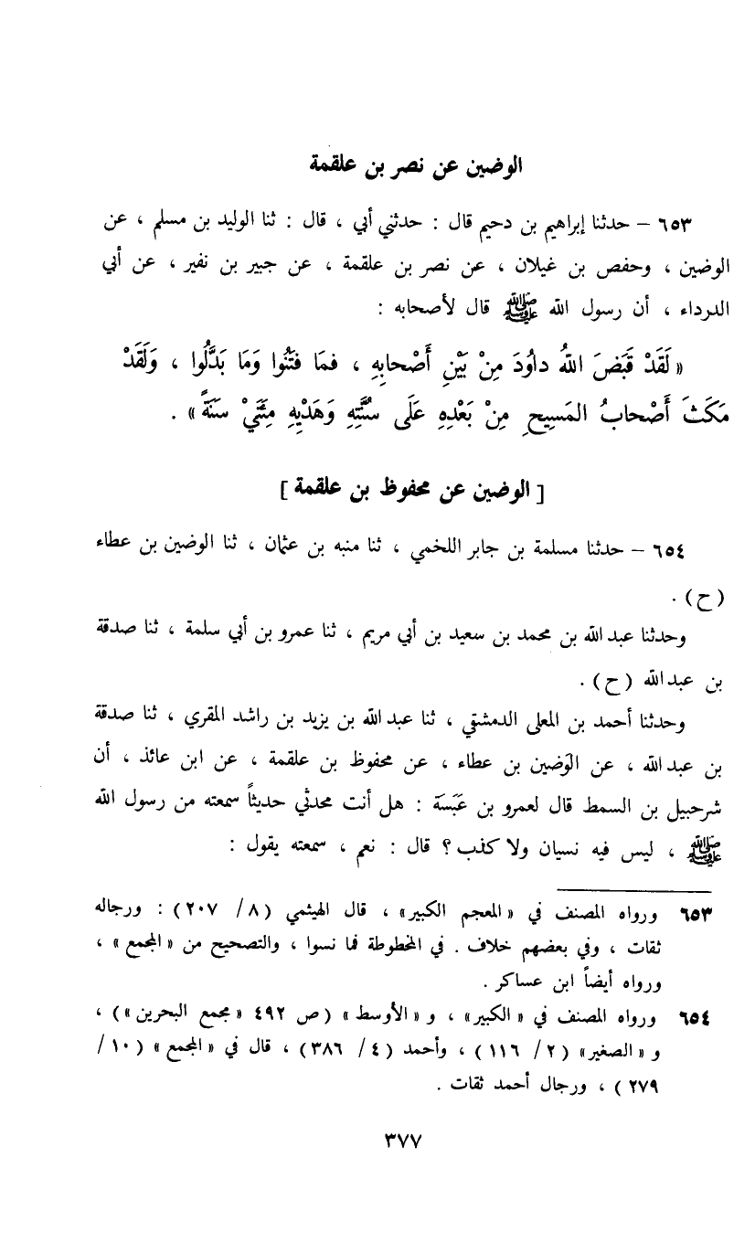 653 - حَدَّثَنَا إِبْرَاهِيمُ بْنُ دُحَيْمٍ، قَالَ: حَدَّثَنِي أَبِي قَالَ: ثنا الْوَلِيدُ بْنُ مُسْلِمٍ، عَنِ الْوَضِينِ، وَحَفْصُ بْنُ غَيْلَانَ , عَنْ نَصْرِ بْنِ عَلْقَمَةَ، عَنْ جُبَيْرِ بْنِ نُفَيْرٍ، عَنْ أَبِي الدَّرْدَاءِ، أَنَّ رَسُولَ اللَّهِ صَلَّى اللهُ عَلَيْهِ وَسَلَّمَ قَالَ لِأَصْحَابِهِ: §«لَقَدْ قَبَضَ اللَّهُ دَاوُدَ مِنْ بَيْنِ أَصْحَابِهِ فَمَا فُتِنُوا وَمَا بَدَّلُوا , وَلَقَدْ مَكَثَ أَصْحَابُ الْمَسِيحِ مِنْ بَعْدِهِ عَلَى سُنَّتِهِ وَهَدْيِهِ مِئَتَيْ سَنَةٍ»