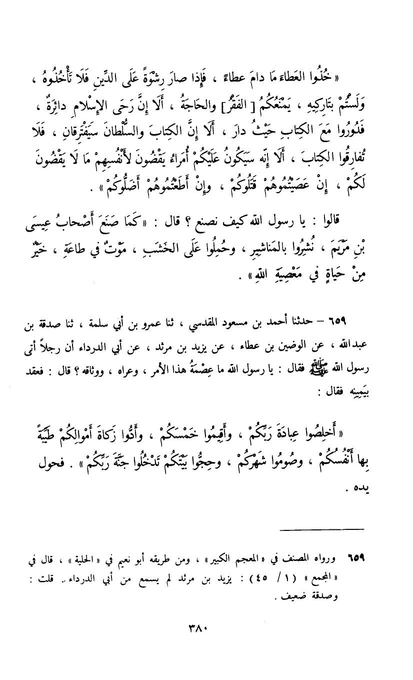 659 - حَدَّثَنَا أَحْمَدُ بْنُ مَسْعُودٍ الْمَقْدِسِيُّ، ثنا عَمْرُو بْنُ أَبِي سَلَمَةَ، ثنا صَدَقَةُ بْنُ عَبْدِ اللَّهِ، عَنِ الْوَضِينِ بْنِ عَطَاءٍ، عَنْ يَزِيدَ بْنِ مَرْثَدٍ، عَنْ أَبِي الدَّرْدَاءِ، أَنَّ رَجُلًا، أَتَى رَسُولَ اللَّهِ صَلَّى اللهُ عَلَيْهِ وَسَلَّمَ فَقَالَ: يَا رَسُولَ اللَّهِ مَا عِصْمَةُ هَذَا الْأَمْرِ وَعُرَاهُ وَوِثَاقِهِ؟ قَالَ: فَعَقَدَ بِيَمِينِهِ فَقَالَ: §«أَخْلِصُوا عِبَادَةَ رَبِّكُمْ وَأَقِيمُوا خَمْسَكُمْ وَأَدُّوا زَكَاةَ أَمْوَالِكُمْ طَيِّبَةً بِهَا أَنْفُسُكُمْ , وَصُومُوا شَهْرَكُمْ , وَحُجُّوا بَيَّتَكُمْ تَدْخُلُوا جَنَّةَ رَبِّكُمْ» فَحَوَّلَ يَدَهُ
