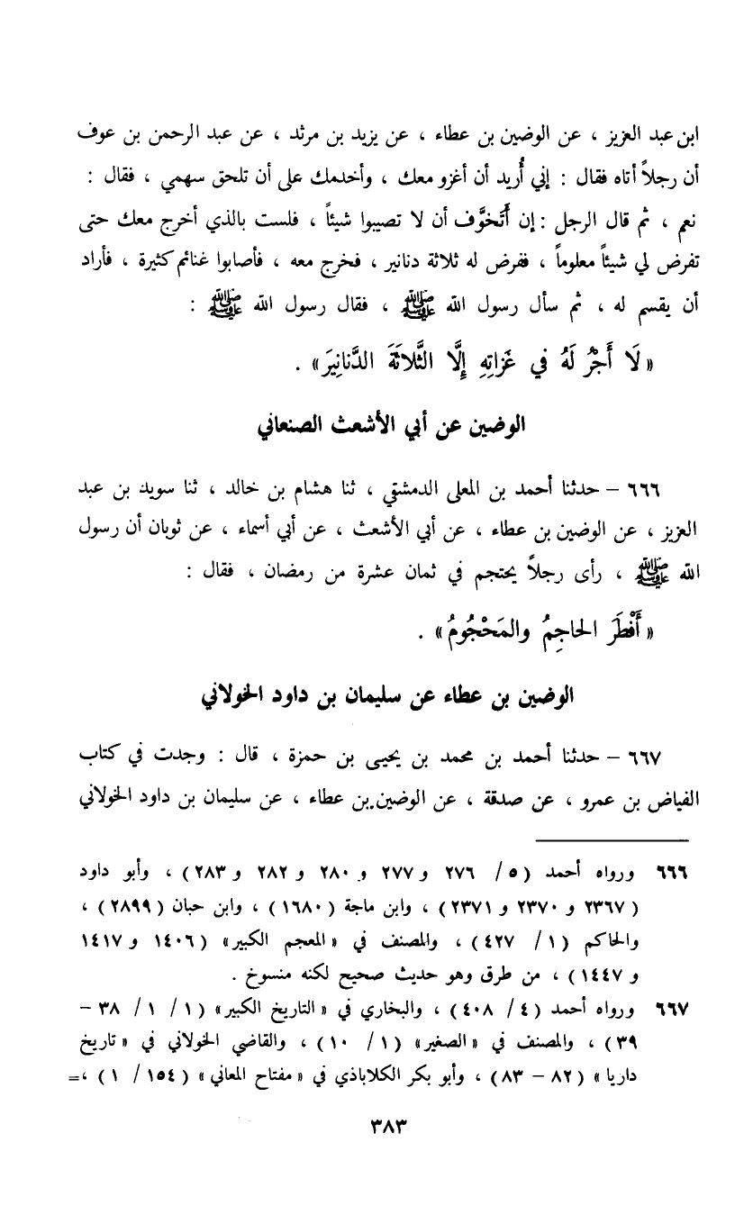 666 - حَدَّثَنَا أَحْمَدُ بْنُ الْمُعَلَّى الدِّمَشْقِيُّ، ثنا هِشَامُ بْنُ خَالِدٍ، ثنا سُوَيْدُ بْنُ عَبْدِ الْعَزِيزِ، عَنِ الْوَضِينِ بْنِ عَطَاءٍ، عَنْ أَبِي الْأَشْعَثَ، عَنْ أَبِي أَسْمَاءَ، عَنْ ثَوْبَانَ، أَنَّ رَسُولَ اللَّهِ صَلَّى اللهُ عَلَيْهِ وَسَلَّمَ رَأَى رَجُلًا يَحْتَجِمُ فِي ثَمَانَ عَشَرَةَ مِنْ رَمَضَانَ فَقَالَ: §«أَفْطَرَ الْحَاجِمُ وَالْمَحْجُومُ»
