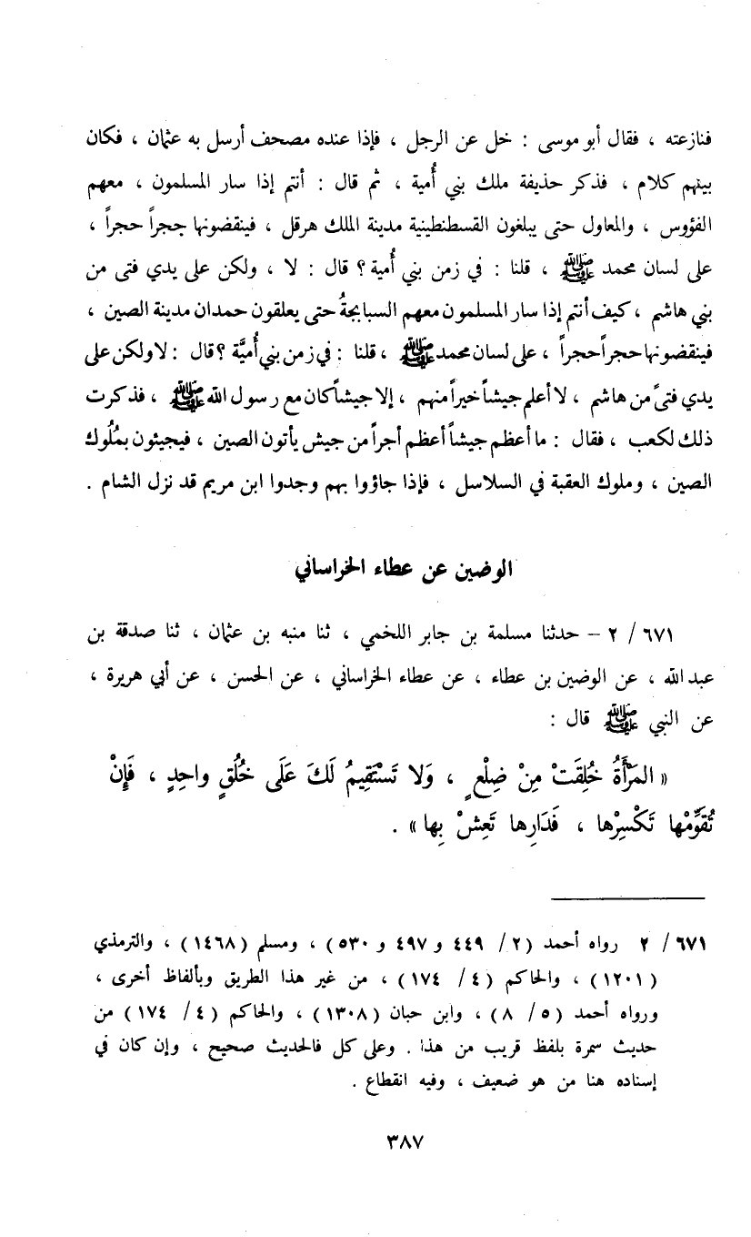 حَدَّثَنَا مَسْلَمَةُ بْنُ جَابِرٍ اللَّخْمِيُّ، ثنا مُنَبِّهُ بْنُ عُثْمَانَ، ثنا صَدَقَةُ بْنُ عَبْدِ اللَّهِ، عَنِ الْوَضِينِ بْنِ عَطَاءٍ، عَنْ عَطَاءٍ الْخُرَاسَانِيِّ، عَنِ الْحَسَنِ، عَنْ أَبِي هُرَيْرَةَ، عَنِ النَّبِيِّ صَلَّى اللهُ عَلَيْهِ وَسَلَّمَ قَالَ: §«الْمَرْأَةُ خُلِقَتْ مِنْ ضِلَعٍ وَلَا تَسْتَقِيمُ لَكَ عَلَى خُلُقٍ وَاحِدٍ فَإِنْ تُقَوِّمْهَا تَكْسِرْهَا فَدَارِهَا تَعِشْ بِهَا»
