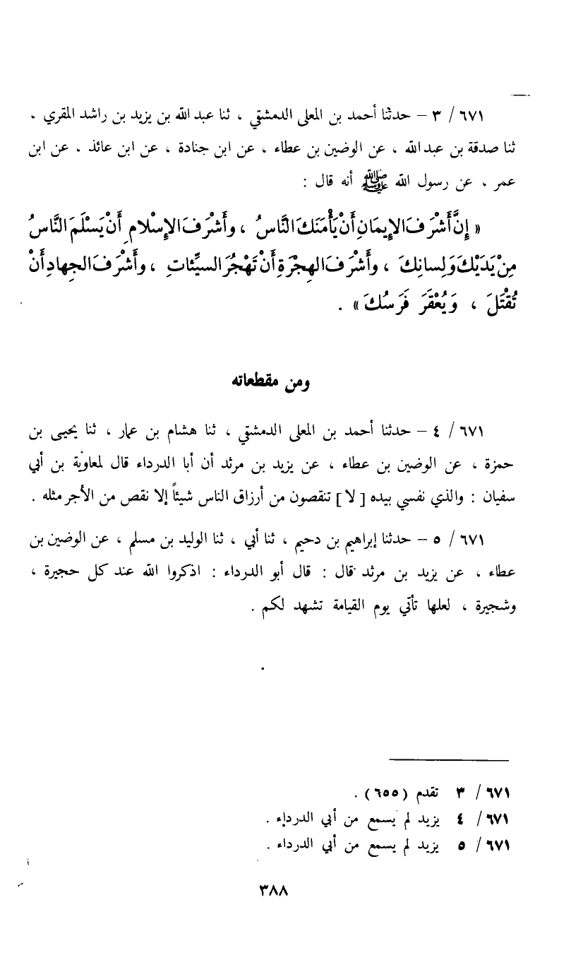 حَدَّثَنَا أَحْمَدُ بْنُ الْمُعَلَّى الدِّمَشْقِيُّ، ثنا عَبْدُ اللَّهِ بْنُ يَزِيدَ بْنِ رَاشِدٍ الْمُقْرِئُ، ثنا صَدَقَةُ بْنُ عَبْدِ اللَّهِ، عَنِ الْوَضِينِ بْنِ عَطَاءٍ، عَنِ ابْنِ جُنَادَةَ، عَنِ ابْنِ عَائِذٍ، عَنِ ابْنِ عُمَرَ، عَنْ رَسُولِ اللَّهِ صَلَّى اللهُ عَلَيْهِ وَسَلَّمَ أَنَّهُ قَالَ: «إِنَّ §أَشْرَفَ الْإِيمَانِ أَنْ يَأْمَنَكَ النَّاسُ وَأَشْرَفَ الْإِسْلَامِ أَنْ يَسْلَمَ النَّاسُ مِنْ يَدَيْكَ وَلِسَانِكَ , وَأَشْرَفَ الْهِجْرَةُ أَنْ تَهْجُرَ السَّيِّئَاتِ , وَأَشْرَفَ الْجِهَادِ أَنْ تُقْتَلَ وَيُعْقَرَ فَرَسُكَ» وَمِنْ مُقَاطَعَاتِهِ