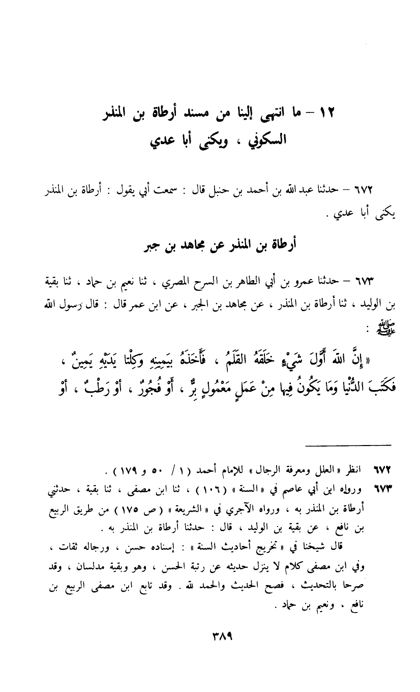 673 - حَدَّثَنَا عَمْرُو بْنُ أَبِي الطَّاهِرِ بْنِ السَّرْحِ الْمِصْرِيُّ، ثنا نُعَيْمُ بْنُ حَمَّادٍ، ثنا بَقِيَّةُ بْنُ الْوَلِيدِ، ثنا أَرْطَاةُ بْنُ الْمُنْذِرِ، عَنْ مُجَاهِدِ بْنِ الْجَبْرِ، عَنِ ابْنِ عُمَرَ، قَالَ: قَالَ رَسُولُ اللَّهِ صَلَّى اللهُ عَلَيْهِ وَسَلَّمَ: " إِنَّ اللَّهَ §أَوَّلَ شَيْءٍ خَلَقَهُ الْقَلَمُ , فَأَخَذَهُ بِيَمِينِهِ , وَكِلْتَا يَدَيْهِ يَمِينٌ , فَكَتَبَ الدُّنْيَا وَمَا يَكُونُ فِيهَا مِنْ عَمَلٍ مَعْمُولٍ , بِرٌّ أَوْ فُجُورٌ أَوْ رَطْبٌ أَوْ يَابِسٌ فَأَحْصَاهُ عِنْدَهُ فِي الذِّكْرِ ثُمَّ قَالَ: اقْرَءُوا إِنْ شِئْتُمْ {هَذَا كِتَابُنَا يَنْطِقُ عَلَيْكُمْ بِالْحَقِّ إِنَّا كُنَّا نَسْتَنْسِخُ مَا كُنْتُمْ تَعْمَلُونَ} [الجاثية: 29] . فَهَلْ تَكُونُ النَّسْخَةُ إِلَّا مِنْ شَيْءٍ قَدْ فُرِغَ مِنْهُ "
