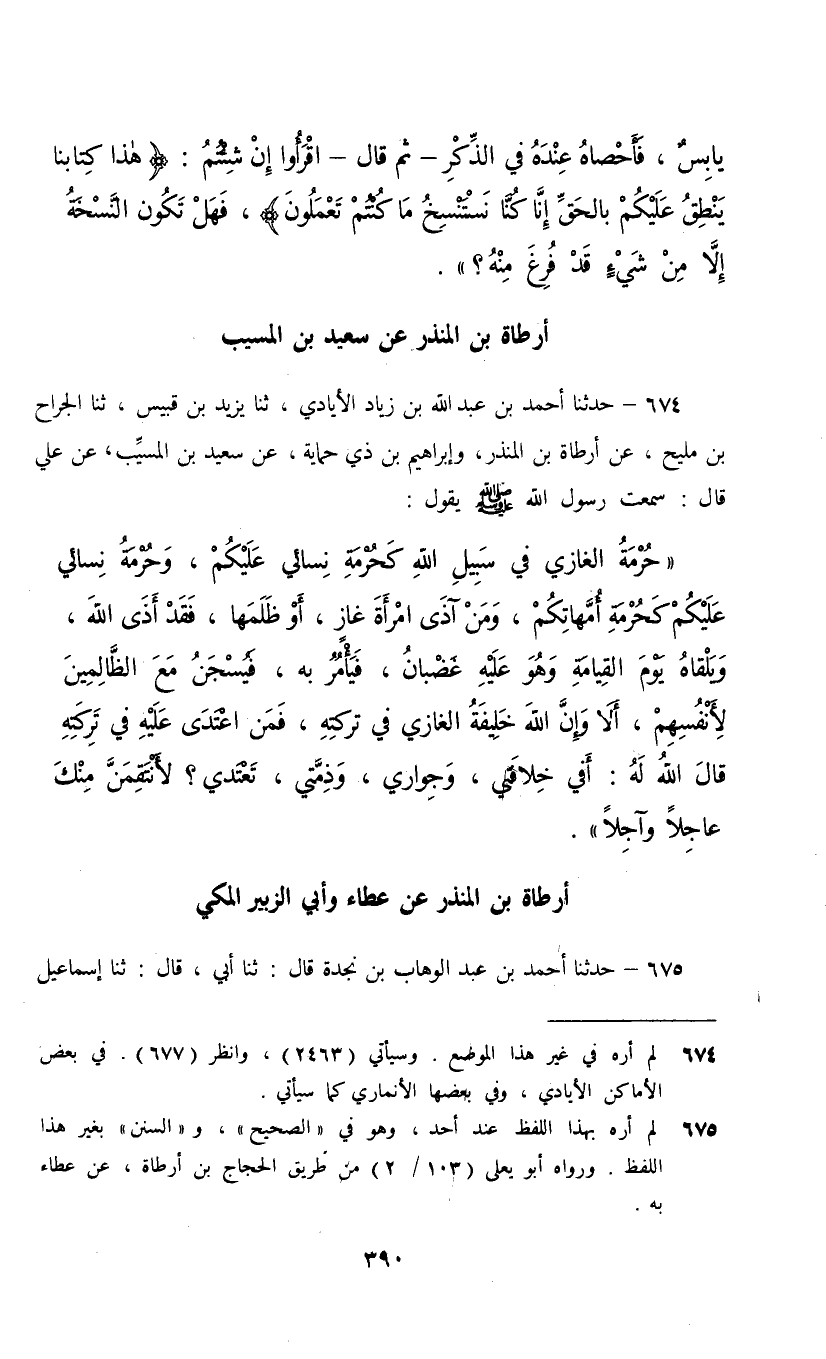 674 - حَدَّثَنَا أَحْمَدُ بْنُ عَبْدِ اللَّهِ بْنِ زِيَادٍ الْأَيَادِيُّ، ثنا يَزِيدُ بْنُ قُبَيْسٍ، ثنا الْجَرَّاحُ بْنُ مَلِيحٍ، عَنْ أَرْطَاةَ بْنِ الْمُنْذِرِ، وَإِبْرَاهِيمَ بْنِ ذِي حِمَايَةٍ , عَنْ سَعِيدِ بْنِ الْمُسَيِّبِ، عَنْ عَلِيٍّ، قَالَ: سَمِعْتُ رَسُولَ اللَّهِ صَلَّى اللهُ عَلَيْهِ وَسَلَّمَ يَقُولُ: §" حُرْمَةُ الْغَازِي فِي سَبِيلِ اللَّهِ كَحُرْمَةِ نِسَائِي عَلَيْكُمْ , وَحُرْمَةُ نِسَائِي عَلَيْكُمْ كَحُرْمَةِ أُمَّهَاتِكُمْ وَمَنْ آذَى امْرَأَةَ غَازٍ أَوْ ظَلَمَهَا فَقَدْ أَذى اللَّهَ وَيَلْقَاهُ يَوْمَ الْقِيَامَةِ وَهُوَ عَلَيْهِ غَضْبَانُ فَيَأْمُرُ بِهِ فَيُسْجَنُ مَعَ الظَّالِمِينَ لِأَنْفُسِهِمْ , أَلَا وَإِنَّ اللَّهَ خَلِيفَةُ الْغَازِي فِي تَرِكَتِهِ فَمَنِ اعْتَدَى عَلَيْهِ فِي تَرِكَتِهِ قَالَ اللَّهُ لَهُ: أَفِي خِلَافَتِي وَجِوَارِي وَذِمَّتِي تَعْتَدِّي , لَأَنْتَقِمَنَّ مِنْكَ عَاجِلًا وَآجِلًا "