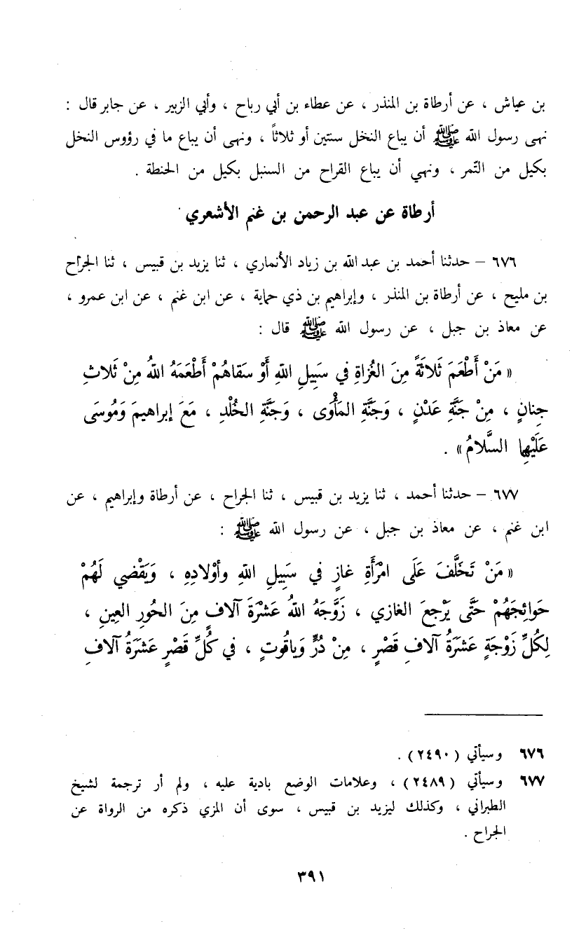 677 - حَدَّثَنَا أَحْمَدُ، ثنا يَزِيدُ بْنُ قُبَيْسِ، ثنا الْجَرَّاحُ، " عَنْ أَرْطَاةَ، وَإِبْرَاهِيمَ , عَنِ ابْنِ غَنْمٍ، عَنْ مُعَاذِ بْنِ جَبَلٍ، عَنْ رَسُولِ اللَّهِ صَلَّى اللهُ عَلَيْهِ وَسَلَّمَ: §«مَنْ تَخَلَّفَ عَلَى امْرَأَةِ غَازٍ فِي سَبِيلِ اللَّهِ وَأَوْلَادِهِ , وَيَقْضِي لَهُمْ حَوَائِجَهُمْ حَتَّى يَرْجِعَ الْغَازِي زَوَّجَهُ اللَّهُ عَشْرَةَ آلَافٍ مِنَ الْحُورِ الْعَيِنِ لِكُلِّ زَوْجَةٍ عَشَرَةُ آلَافِ قَصْرٍ مِنْ دُرٍّ وَيَاقُوتٍ , فِي كُلِّ قَصْرٍ عَشْرَةُ آلَافِ دَارٍ فِي كُلِّ دَارٍ عَشَرَةُ آلَافِ بَيْتٍ , فِي كُلِّ بَيْتٍ سَرِيرٌ مِنْ دُرٍّ وَيَاقُوتٍ عَلَى كُلِّ سَرِيرٍ جَارِيَةٌ لَوْ بَرَزَ سَوَادُهَا لَغَلَبَ نُورُهُ عَلَى ضَوْءِ الشَّمْسِ وَالْقَمَرِ»