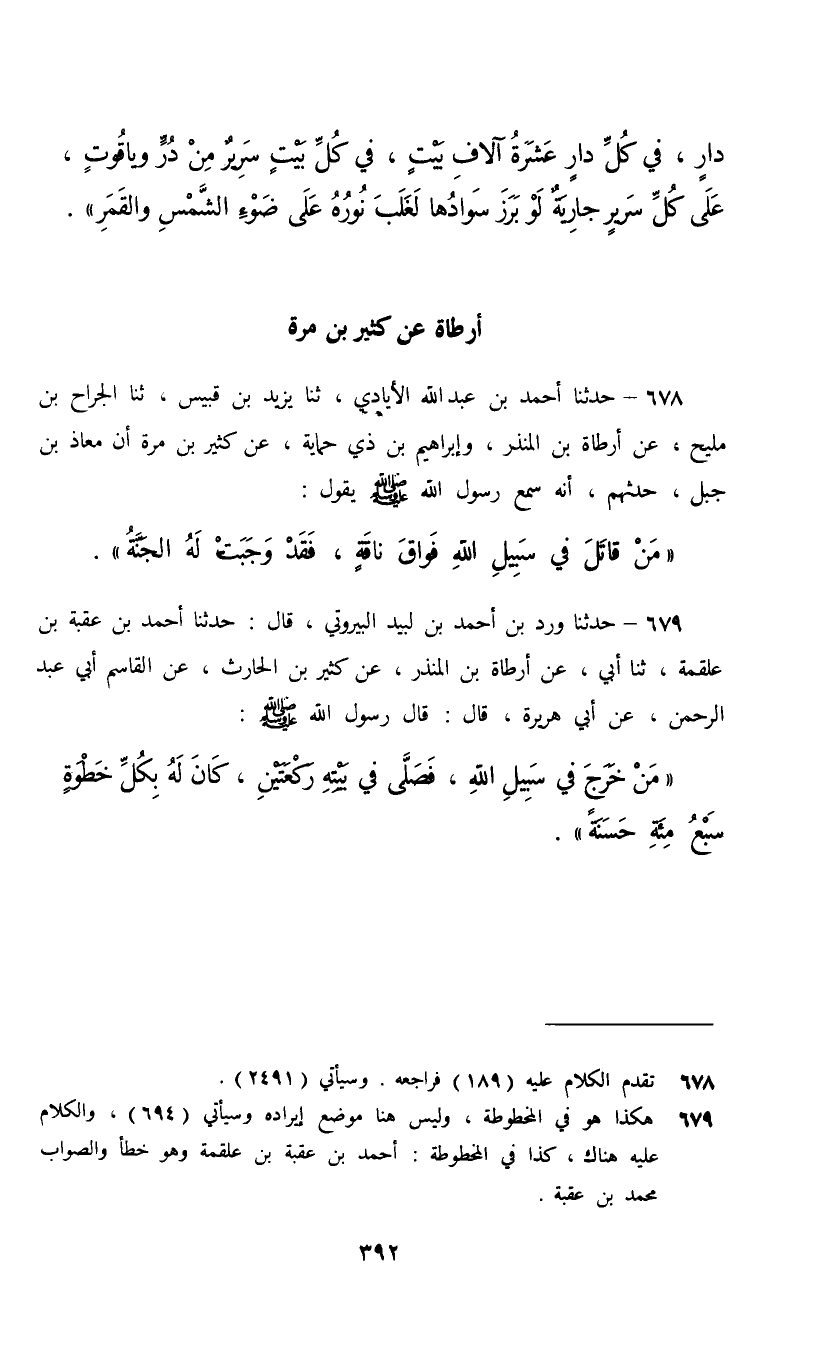 679 - حَدَّثَنَا وَرَدُ بْنُ أَحْمَدَ بْنِ لَبِيدٍ الْبَيْرُوتِيُّ، قَالَ: حَدَّثَنَا أَحْمَدُ بْنُ عُقْبَةَ بْنِ عَلْقَمَةَ، ثنا أَبِي، عَنْ أَرْطَاةَ بْنِ الْمُنْذِرِ، عَنْ كَثِيرِ بْنِ الْحَارِثِ، عَنِ الْقَاسِمِ أَبِي عَبْدِ الرَّحْمَنِ، عَنْ أَبِي هُرَيْرَةَ، قَالَ: قَالَ رَسُولُ اللَّهِ صَلَّى اللهُ عَلَيْهِ وَسَلَّمَ: §«مَنْ خَرَجَ فِي سَبِيلِ اللَّهِ فَصَلَّى فِي بَيْتِهِ رَكْعَتَيْنِ كَانَ لَهُ بِكُلِّ خُطْوَةٍ سَبْعُ مِائَةِ حَسَنَةٍ»