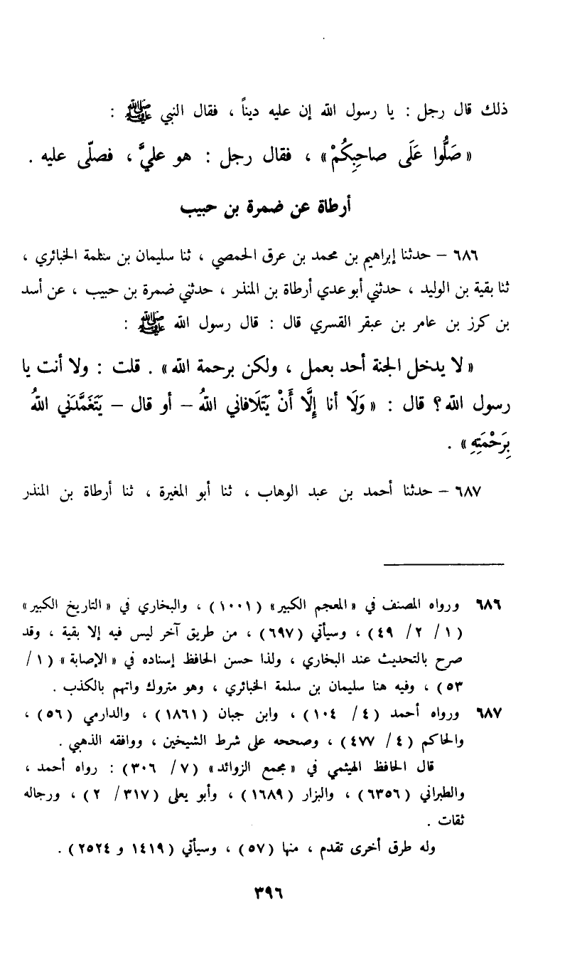 686 - حَدَّثَنَا إِبْرَاهِيمُ بْنُ مُحَمَّدِ بْنِ عِرْقٍ الْحِمْصِيُّ، ثنا سُلَيْمَانُ بْنُ سَلَمَةَ الْخَبَائِرِيُّ، ثنا بَقِيَّةُ بْنُ الْوَلِيدِ، حَدَّثَنِي أَبُو عَدِيٍّ أَرْطَاةُ بْنُ الْمُنْذِرِ , حَدَّثَنِي ضَمْرَةُ بْنُ حَبِيبٍ، عَنْ أَسَدِ بْنِ كُرْزِ بْنِ عَامِرِ بْنِ عبقرٍ الْقَسْرِيِّ، قَالَ: قَالَ رَسُولُ اللَّهِ صَلَّى اللهُ عَلَيْهِ وَسَلَّمَ: §«لَا يَدْخُلُ الْجَنَّةَ أَحَدٌ بِعَمَلٍ وَلَكِنْ بِرَحْمَةِ اللَّهِ» . قُلْتُ: وَلَا أَنْتَ يَا رَسُولَ اللَّهِ؟ قَالَ: «وَلَا أَنَا إِلَّا أَنْ يَتَلَافَانِيَ اللَّهُ أَوْ قَالَ يَتَغَمَّدَنِيَ اللَّهُ بِرَحْمَتِهِ»