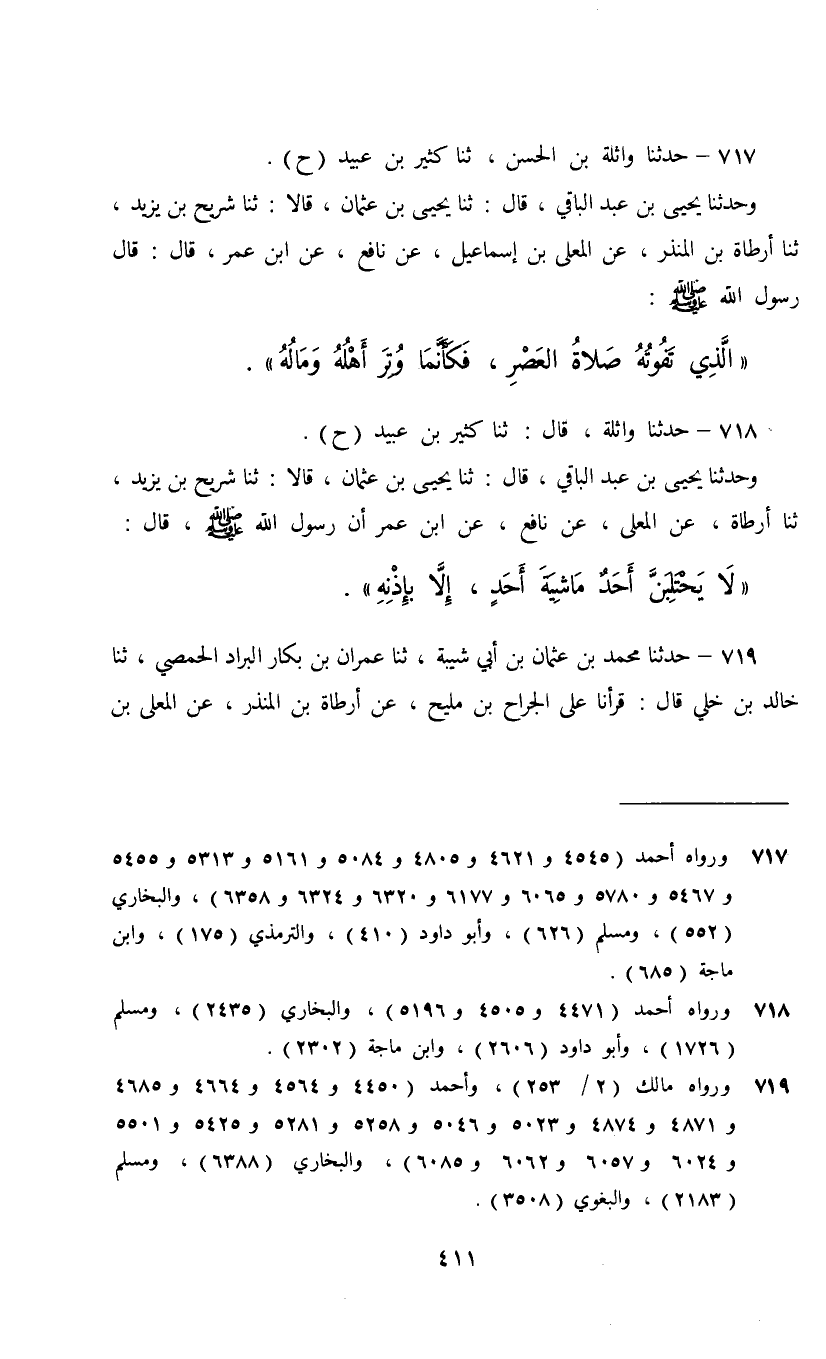 717 - حَدَّثَنَا وَاثِلَةُ بْنُ الْحَسَنِ، ثنا كَثِيرُ بْنُ عُبَيْدٍ، ح وَحَدَّثَنَا يَحْيَى بْنُ عَبْدِ الْبَاقِي، قَالَ: ثنا يَحْيَى بْنُ عُثْمَانَ، ثنا شُرَيْحُ بْنُ يَزِيدَ، ثنا أَرْطَاةُ بْنُ الْمُنْذِرِ، عَنِ الْمُعَلَّى بْنِ إِسْمَاعِيلَ، عَنْ نَافِعٍ، عَنِ ابْنِ عُمَرَ، قَالَ: قَالَ رَسُولُ اللَّهِ صَلَّى اللهُ عَلَيْهِ وَسَلَّمَ: §«الَّذِي تَفُوتُهُ صَلَاةُ الْعَصْرِ فَكَأَنَّمَا وُتِرَ أَهْلُهُ وَمَالُهُ»