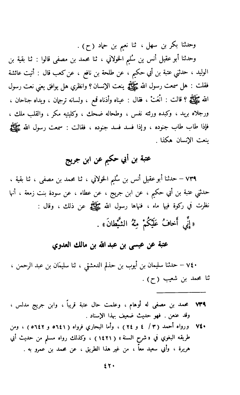 739 - حَدَّثَنَا أَبُو عَقِيلٍ أَنَسُ بْنُ سُلَيْمٍ الْخَوْلَانِيُّ , ثنا مُحَمَّدُ بْنُ مُصَفًّى، ثنا بَقِيَّةُ، حَدَّثَنِي عُتْبَةُ بْنُ أَبِي حَكِيمِ، عَنِ ابْنِ جُرَيْجٍ، عَنْ عَطَاءٍ، عَنْ سَوْدَةَ بِنْتِ زَمْعَةَ، أَنَّهَا نَظَرَتْ فِي رَكْوَةٍ فِيهَا مَاءٌ فَنَهَاهَا رَسُولُ اللَّهِ صَلَّى اللهُ عَلَيْهِ وَسَلَّمَ عَنْ ذَلِكَ , وَقَالَ: «إِنِّي §أَخَافُ عَلَيْكُمْ مِنْهُ الشَّيْطَانُ»