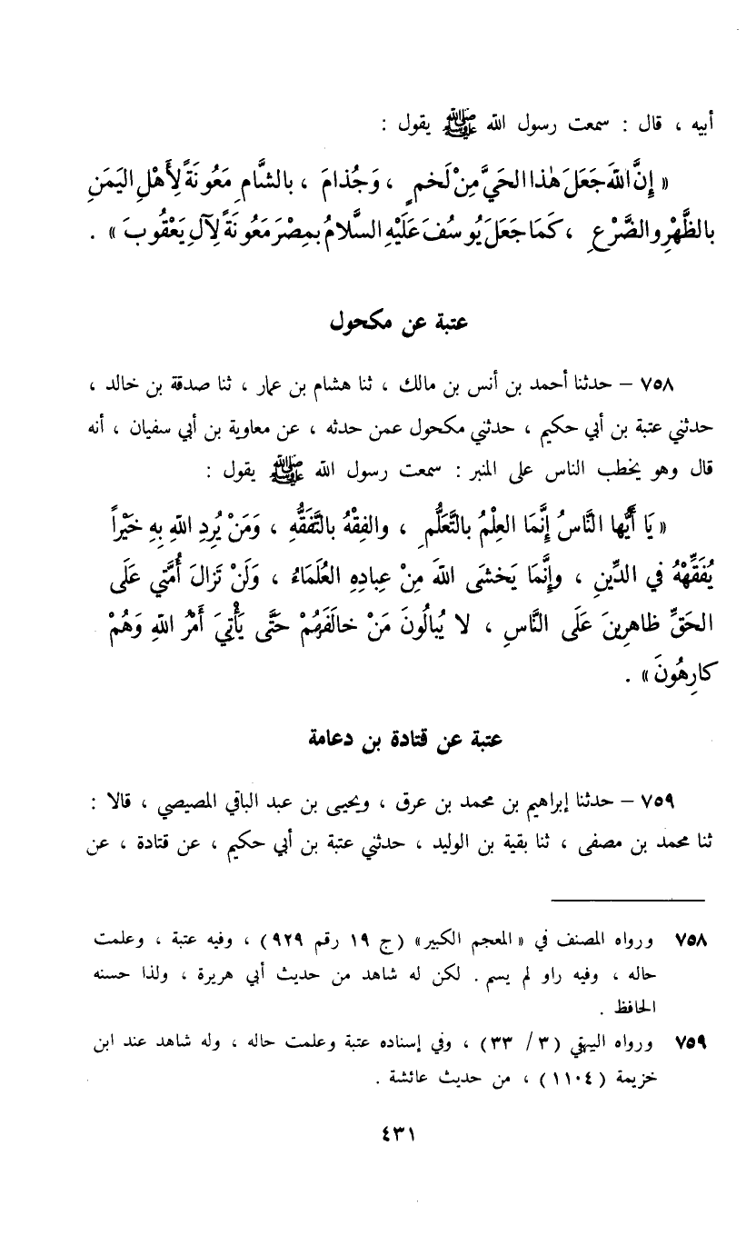 758 - حَدَّثَنَا أَحْمَدُ بْنُ أَنَسِ بْنِ مَالِكٍ، ثنا هِشَامُ بْنُ عَمَّارٍ، ثنا صَدَقَةُ بْنُ خَالِدٍ، حَدَّثَنِي عُتْبَةُ بْنُ أَبِي حَكِيمِ، حَدَّثَنِي مَكْحُولٌ، عَمَّنْ حَدَّثَهُ , عَنْ مُعَاوِيَةَ بْنِ أَبِي سُفْيَانَ، أَنَّهُ قَالَ وَهُوَ يَخْطُبُ النَّاسَ عَلَى الْمِنْبَرِ: سَمِعْتُ رَسُولَ اللَّهِ صَلَّى اللهُ عَلَيْهِ وَسَلَّمَ يَقُولُ: «يَا أَيُّهَا النَّاسُ إِنَّمَا §الْعِلْمُ بِالتَّعَلُّمِ , وَالْفِقْهُ بِالتَّفَقُّهِ , وَمَنْ يُرِدِ اللَّهُ بِهِ خَيْرًا يُفَقِّهْهُ فِي الدِّينِ , وَإِنَّمَا يَخْشَى اللَّهَ مِنْ عِبَادِهِ الْعُلَمَاءُ , وَلَنْ تَزَالَ أُمَّتِي عَلَى الْحَقِّ ظَاهِرِينَ عَلَى النَّاسِ لَا يُبَالُونَ مَنْ خَالَفَهُمْ حَتَّى يَأْتِيَ أَمُرُ اللَّهِ وَهُمْ كَارِهُوَنَ»