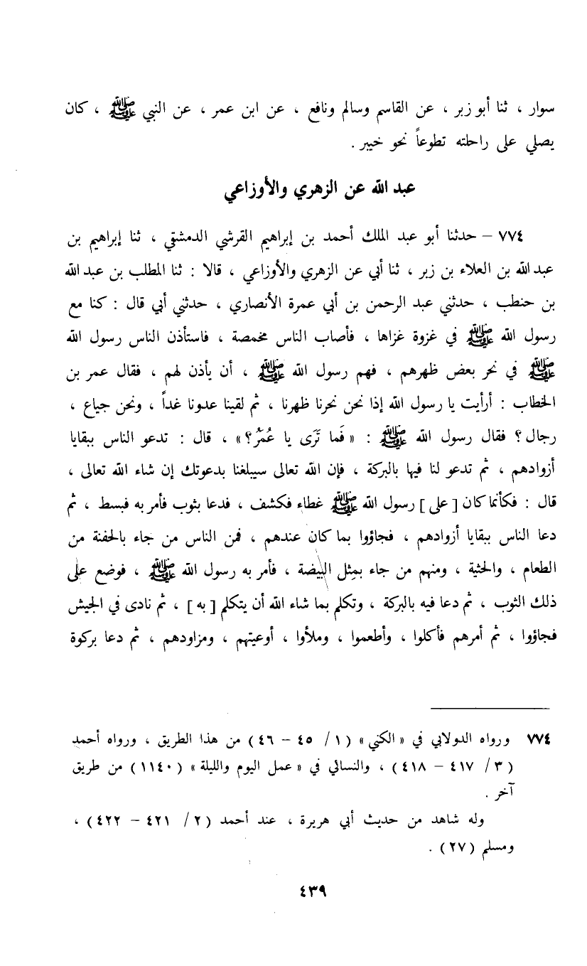 774 - حَدَّثَنَا أَبُو عَبْدِ الْمَلِكِ أَحْمَدُ بْنُ إِبْرَاهِيمَ الْقُرَشِيُّ الدِّمَشْقِيُّ , ثنا إِبْرَاهِيمُ بْنُ عَبْدِ اللَّهِ بْنِ الْعَلَاءِ بْنِ زَبْرٍ، ثنا أَبِي، عَنِ الزُّهْرِيِّ، وَالْأَوْزَاعِيِّ، قَالَا: ثنا الْمُطَّلِبُ بْنُ عَبْدِ اللَّهِ بْنِ حَنْطَبٍ، حَدَّثَنِي عَبْدُ الرَّحْمَنِ بْنُ أَبِي عَمْرَةَ الْأَنْصَارِيُّ، حَدَّثَنِي أَبِي، قَالَ كُنَّا مَعَ رَسُولِ اللَّهِ صَلَّى اللهُ عَلَيْهِ وَسَلَّمَ فِي غَزْوَةٍ غَزَاهَا فَأَصَابَ النَّاسَ مَخْمَصَةٌ فَاسْتَأْذَنَ النَّاسُ رَسُولَ اللَّهِ صَلَّى اللهُ عَلَيْهِ وَسَلَّمَ فِي نَحْرِ بَعْضِ ظَهْرِهِمْ , فَهَمَّ رَسُولُ اللَّهِ صَلَّى اللهُ عَلَيْهِ وَسَلَّمَ أَنْ يَأْذَنَ لَهُمْ فَقَالَ عُمَرُ بْنُ الْخَطَّابِ: أَرَأَيْتَ يَا رَسُولَ اللَّهِ إِذَا نَحْنُ نَحَرْنَا ظَهَرْنَا ثُمَّ لَقِينَا عَدُوَّنَا غَدًا وَنَحْنُ جِيَاعٌ رِجَالٌ؟ فَقَالَ رَسُولُ اللَّهِ صَلَّى اللهُ عَلَيْهِ وَسَلَّمَ: «فَمَا تَرَى يَا عُمَرُ؟» قَالَ: تَدْعُو النَّاسَ بِبَقَايَا أَزْوَادِهِمْ ثُمَّ تَدْعُوا لَنَا فِيهَا بِالْبَرَكَةِ فَإِنَّ اللَّهَ تَعَالَى سَيُبَلِّغُنَا بِدَعْوَتِكَ إِنْ شَاءَ اللَّهُ تَعَالَى قَالَ: فَكَأَنَّمَا كَانَ [عَلَى] رَسُولِ اللَّهِ صَلَّى اللهُ عَلَيْهِ وَسَلَّمَ غِطَاءٌ فَكُشِفَ فَدَعَا بِثَوْبٍ فَأَمَرَ بِهِ فَبَسِطَ , ثُمَّ دَعَا النَّاسَ بِبَقَايَا أَزْوَادِهِمْ , فَجَاءُوا بِمَا كَانَ عِنْدَهُمْ فَمِنَ النَّاسِ مَنْ جَاءَ بِالْحَفْنَةِ مِنَ الطَّعَامِ , وَالْحَثْيَةِ , وَمِنْهُمْ مَنْ جَاءَ بِمِثْلِ الْبَيْضَةِ فَأَمَرَ بِهِ رَسُولُ اللَّهِ صَلَّى اللهُ عَلَيْهِ وَسَلَّمَ فَوُضِعَ عَلَى ذَلِكَ الثَّوْبِ , ثُمَّ دَعَا فِيهِ بِالْبَرَكَةِ وَتَكَلَّمَ بِمَا شَاءَ اللَّهُ أَنْ يَتَكَلَّمَ [بِهِ] , ثُمَّ نَادَى فِي الْجَيْشِ فَجَاءُوا ثُمَّ أَمَرَهُمْ فَأَكَلُوا وَأَطْعَمُوا , وَمَلَأُوا أَوْعِيَتَهُمْ وَمَزَاوَدَهُمْ , ثُمَّ دَعَا بِرَكْوَةٍ فَوُضِعَتْ بَيْنَ يَدَيْهِ , ثُمَّ دَعَا بِمَاءٍ فَصَبَّهُ فِيهَا , ثُمَّ مَجَّ فِيهَا , [وَتَكَلَّمَ] بِمَا شَاءَ اللَّهُ أَنْ يَتَكَلَّمَ [بِهِ] , ثُمَّ أَدْخَلَ خِنْصَرَهُ [كَفَّيْهِ] فِيهَا فَأُقْسِمُ بِاللَّهِ لَقَدْ رَأَيْتُ أَصَابِعَ رَسُولِ اللَّهِ صَلَّى اللهُ عَلَيْهِ وَسَلَّمَ تَتَفَجَّرُ يَنَابِيعَ مِنَ الْمَاءِ , ثُمَّ أَمَرَ النَّاسَ فَشَرِبُوا , وَسَقَوْا , وَمَلَأُوا قِرَبَهُمْ , وَأَدَوَاتَهُمْ , ثُمَّ ضَحِكَ رَسُولُ اللَّهِ صَلَّى اللهُ عَلَيْهِ وَسَلَّمَ حَتَّى بَدَتْ نَوَاجِذُهُ ثُمَّ قَالَ: §«أَشْهَدُ أَنْ لَا إِلَهَ إِلَّا اللَّهُ وَحْدَهُ لَا شَرِيكَ لَهُ وَأَنَّ مُحَمَّدًا عَبْدُهُ وَرَسُولُهُ , لَا يَلْقَى اللَّهَ بِهِمَا أَحَدٌ يَوْمَ الْقِيَامَةِ إِلَّا [أُ] دْخِلَ الْجَنَّةَ عَلَى مَا كَانَ»