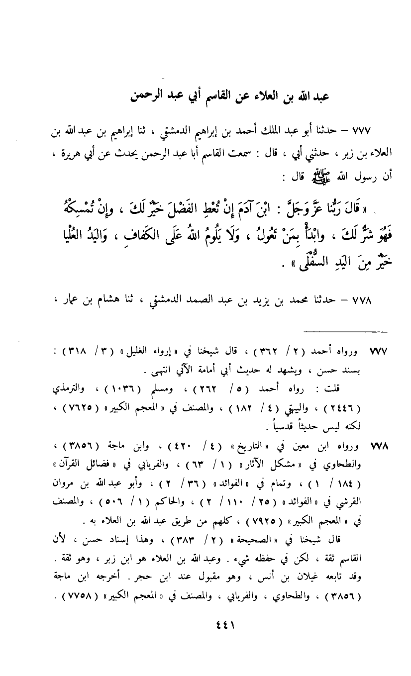 777 - حَدَّثَنَا أَبُو عَبْدِ الْمَلِكِ أَحْمَدُ بْنُ إِبْرَاهِيمَ الدِّمَشْقِيُّ , ثنا إِبْرَاهِيمُ بْنُ عَبْدِ اللَّهِ بْنِ الْعَلَاءِ بْنِ زَبْرٍ، حَدَّثَنِي أَبِي، قَالَ: سَمِعْتُ الْقَاسِمَ أَبَا عَبْدِ الرَّحْمَنِ، يُحَدِّثُ عَنْ أَبِي هُرَيْرَةَ، أَنَّ رَسُولَ اللَّهِ صَلَّى اللهُ عَلَيْهِ وَسَلَّمَ قَالَ: قَالَ رَبُّنَا عَزَّ وَجَلَّ §«ابْنَ آدَمَ إِنْ تُعْطِ الْفَضْلَ خَيْرٌ لَكَ , وَإِنْ تُمْسِكْهُ فَهُوَ شَرٌّ لَكَ , وَابْدَأْ بِمَنْ تَعُولُ , وَلَا يَلُومُ اللَّهُ عَلَى الْكَفَافِ , وَالْيَدُ الْعُلْيَا خَيْرٌ مِنَ الْيَدِ السُّفْلَى»