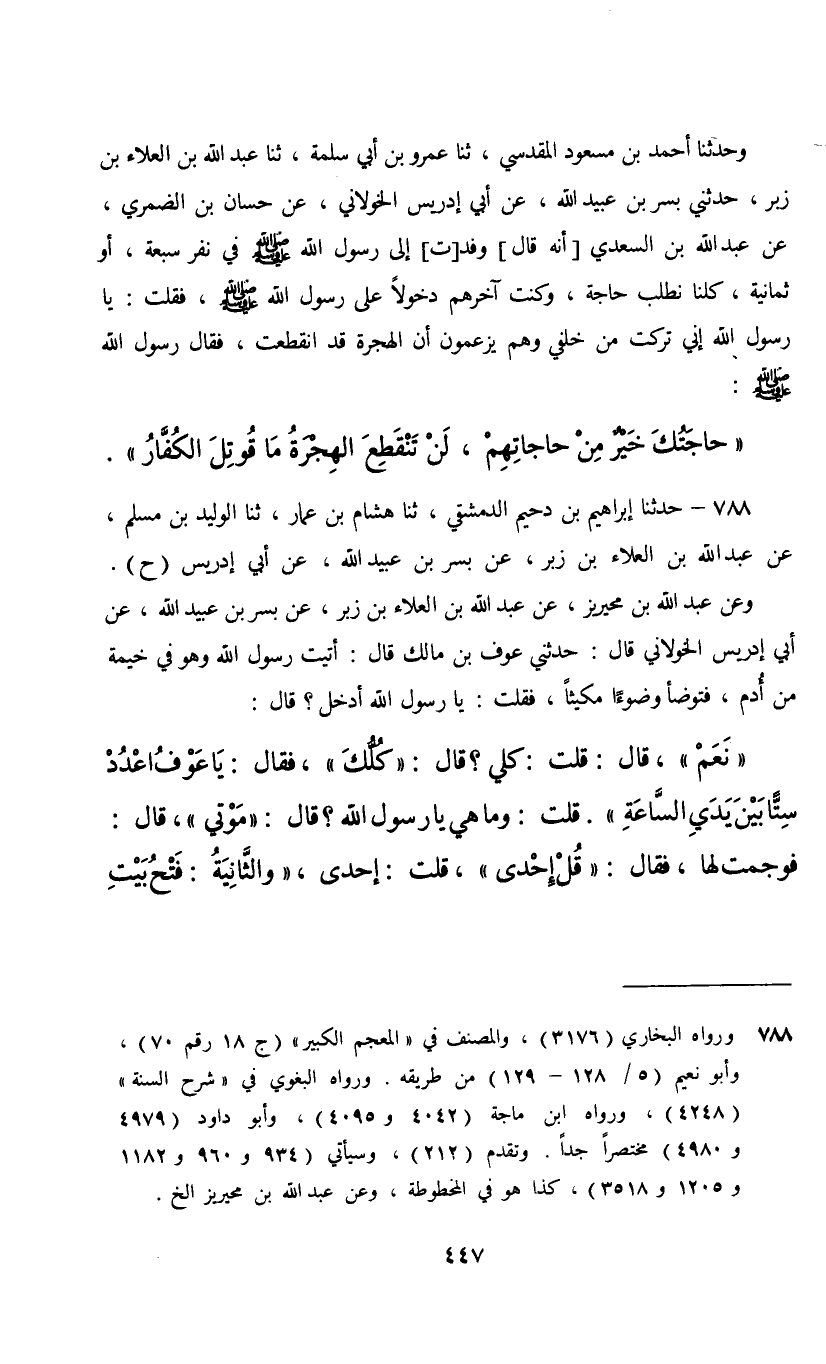 788 - حَدَّثَنَا إِبْرَاهِيمُ بْنُ دُحَيْمٍ الدِّمَشْقِيُّ، ثنا هِشَامُ بْنُ عَمَّارٍ، ثنا الْوَلِيدُ بْنُ مُسْلِمٍ، عَنْ عَبْدِ اللَّهِ بْنِ الْعَلَاءِ بْنِ زَبْرٍ، عَنْ بُسْرِ بْنِ عُبَيْدِ اللَّهِ، عَنْ أَبِي إِدْرِيسَ، ح , وَعَنْ عَبْدِ اللَّهِ بْنِ مُحَيْرِيزٍ، عَنْ عَبْدِ اللَّهِ بْنِ الْعَلَاءِ بْنِ زَبْرٍ، عَنْ بُسْرِ بْنِ عُبَيْدِ اللَّهِ، عَنْ أَبِي إِدْرِيسَ الْخَوْلَانِيِّ، قَالَ: حَدَّثَنِي عَوْفُ بْنُ مَالِكٍ، قَالَ: أَتَيْتُ رَسُولَ اللَّهِ وَهُوَ فِي خَيْمَةٍ مِنْ أَدَمٍ فَتَوَضَّأَ وُضُوءًا مَكِيثًا فَقُلْتُ يَا رَسُولَ اللَّهِ أَدْخُلُ؟ قَالَ: «نَعَمْ» قَالَ: قُلْتُ: كُلِي؟ قَالَ: «كُلُّكَ» فَقَالَ: «يَا عَوْفُ §اعْدُدْ سِتًّا بَيْنَ يَدَيِ السَّاعَةِ» قُلْتُ: وَمَا هِيَ يَا رَسُولَ اللَّهِ قَالَ: «مَوْتِي» قَالَ: فَوَجَمْتُ لَهَا فَقَالَ: «قُلْ إِحْدَى» قُلْتُ إِحْدَى , «وَالثَّانِيَةُ فَتْحُ بَيْتِ الْمَقْدِسِ , وَالثَّالِثَةُ مَوَتَانٌ فِيكُمْ مِثْلُ قُعَاصِ الْغَنَمِ , وَالرَّابِعَةُ إِفَاضَةُ الْمَالِ حَتَّى يُعْطَى الرَّجُلُ مِائَةَ دِينَارٍ فَيَظَلُّ يَتَسَخَّطُهَا , وَفِتْنَةٌ لَا يَبْقَى بَيْتٌ مِنَ الْعَرَبِ إِلَّا دَخَلَتْهُ وَفِتْنَةٌ تَكُونُ بَيْنَكُمْ وَبَيْنَ بَنِي الْأَصْفَرِ ثُمَّ يَغْدِرُونَ فَيَأْتُونَكُمْ تَحْتَ ثَمَانِينَ غَايَةً , كُلُّ غَايَةٍ اثْنَا عَشَرَ أَلْفًا»