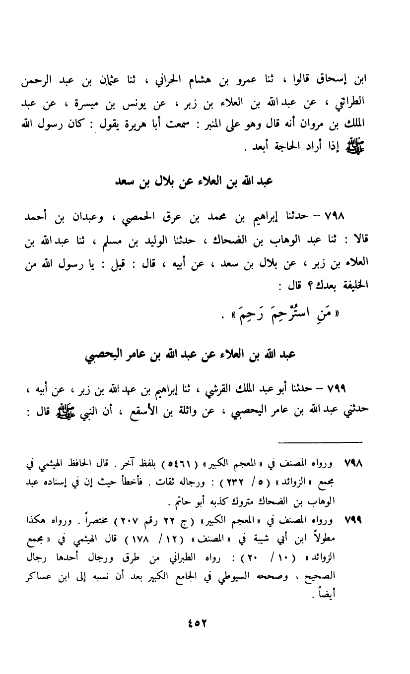 798 - حَدَّثَنَا إِبْرَاهِيمُ بْنُ مُحَمَّدِ بْنِ عِرْقٍ الْحِمْصِيُّ، وَعَبْدَانُ بْنُ أَحْمَدَ، قَالَا: ثنا عَبْدُ الْوَهَّابِ بْنُ الضَّحَّاكِ، حَدَّثَنَا الْوَلِيدُ بْنُ مُسْلِمٍ، ثنا عَبْدُ اللَّهِ بْنُ الْعَلَاءِ بْنِ زَبْرٍ، عَنْ بِلَالِ بْنِ سَعْدٍ، عَنْ أَبِيهِ، قَالَ: قِيلَ يَا رَسُولَ اللَّهِ مَنِ الْخَلِيفَةُ بَعْدَكَ؟ قَالَ: §«مَنِ اسْتَرْحَمَ رَحِمَ»