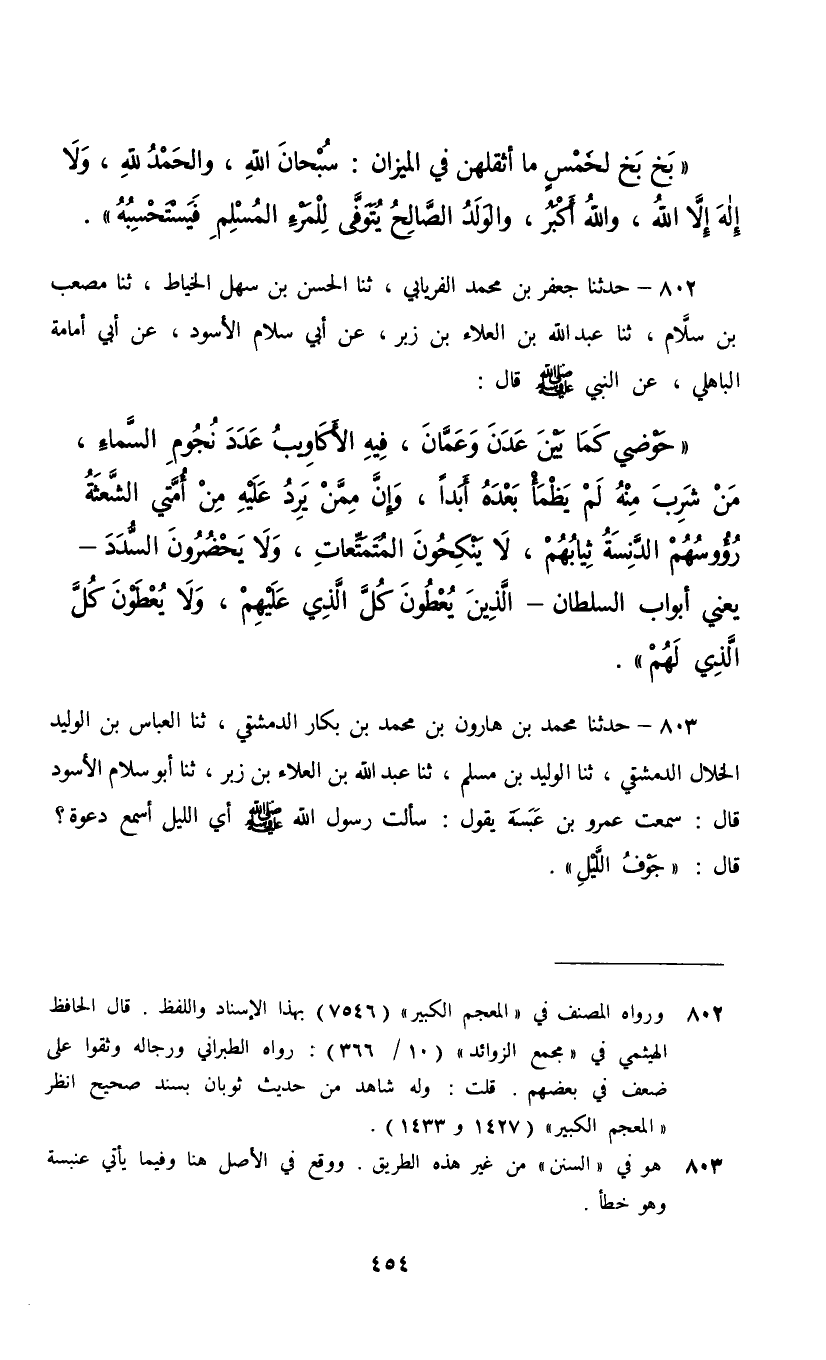 802 - حَدَّثَنَا جَعْفَرُ بْنُ مُحَمَّدٍ الْفِرْيَابِيُّ، ثنا الْحَسَنُ بْنُ سَهْلٍ الْخَيَّاطُ، ثنا مُصْعَبُ بْنُ سَلَّامٍ، ثنا عَبْدُ اللَّهِ بْنُ الْعَلَاءِ بْنِ زَبْرٍ، عَنْ أَبِي سَلَّامٍ الْأَسْوَدِ، عَنْ أَبِي أُمَامَةَ الْبَاهِلِيِّ، عَنِ النَّبِيِّ صَلَّى اللهُ عَلَيْهِ وَسَلَّمَ قَالَ: §«حَوْضِي كَمَا بَيْنَ عَدْنَ وَعَمَّانَ فِيهِ الْأَكَاوِيبُ عَدَدَ نُجُومِ السَّمَاءِ مَنْ شَرِبَ مِنْهُ لَمْ يَظْمَأْ بَعْدَهُ أَبَدًا وَإِنَّ مِمَّنْ يَرِدُ عَلَيْهِ مِنْ أُمَّتِي الشَّعِثَةُ رُءُوسُهُمُ , الدَّنِسَةُ ثِيَابُهُمْ لَا يَنْكِحُونَ الْمُتَمَتِّعَاتِ , وَلَا يَحْضُرُونَ السُّدَدَ يَعْنِي أَبْوَابَ السُّلْطَانِ الَّذِينَ يُعْطُونَ كُلَّ الَّذِي عَلَيْهِمْ وَلَا يُعْطَوْنَ كُلَّ الَّذِي لَهُمْ»