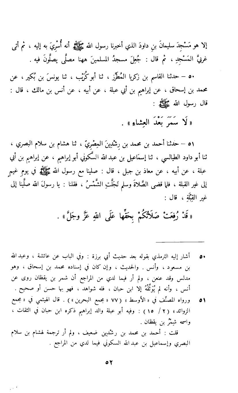 50 - حَدَّثَنَا الْقَاسِمُ بْنُ زَكَرِيَّا الْمُطَرِّزُ، ثنا أَبُو كُرَيْبٍ، ثنا يُونُسُ بْنُ بُكَيْرٍ، عَنْ مُحَمَّدِ بْنِ إِسْحَاقَ، عَنْ إِبْرَاهِيمَ بْنِ أَبِي عَبْلَةَ، عَنْ أَبِيهِ، عَنْ أَنَسِ بْنِ مَالِكٍ، قَالَ: قَالَ رَسُولُ اللَّهِ صَلَّى اللهُ عَلَيْهِ وَسَلَّمَ: §«لَا سَمَرَ بَعْدَ الْعِشَاءِ»