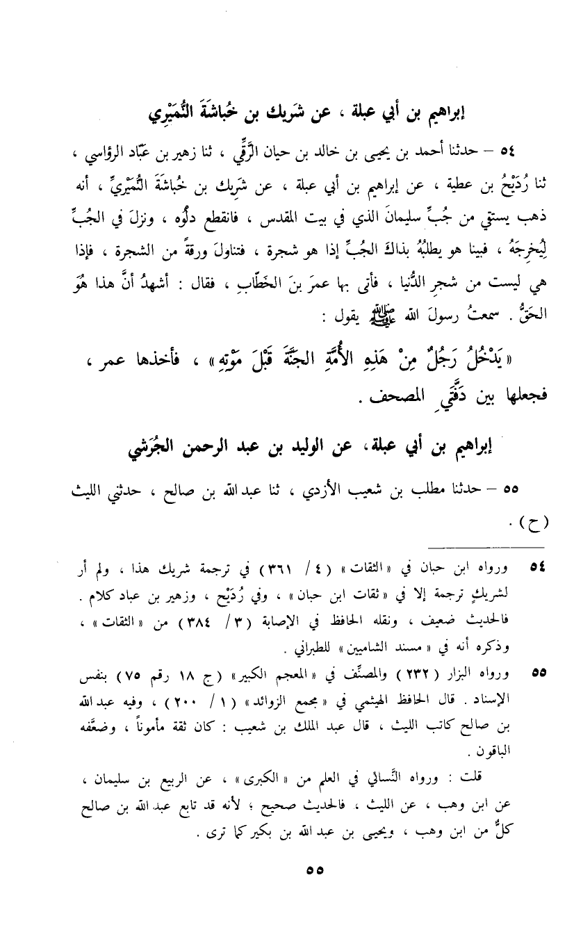 54 - حَدَّثَنَا أَحْمَدُ بْنُ يَحْيَى بْنِ خَالِدِ بْنِ حَيَّانَ الرَّقِّيُّ، ثنا زُهَيْرُ بْنُ عَبَّادٍ الرُّؤَاسِيُّ، ثنا رُدَيْحُ بْنُ عَطِيَّةَ، عَنْ إِبْرَاهِيمَ بْنِ أَبِي عَبْلَةَ، عَنْ شَرِيكِ بْنِ خُبَاشَةَ النُّمَيْرِيِّ، أَنَّهُ ذَهَبَ يَسْتَقِي مِنْ جُبِّ سُلَيْمَانَ الَّذِي فِي بَيْتِ الْمَقْدِسِ فَانْقَطَعَ دَلْوُهُ وَنَزَلَ فِي الْجُبِّ لِيُخْرِجَهُ فَبَيْنَا هُوَ يَطْلُبُهُ بِذَاكَ الْجُبِّ إِذَا هُوَ شَجَرَةٌ فَتَنَاوَلَ وَرَقَةً مِنَ الشَّجَرَةِ , فَإِذَا هِيَ لَيْسَتْ مِنْ شَجَرِ الدُّنْيَا فَأَتَى بِهَا عُمَرَ بْنَ الْخَطَّابِ فَقَالَ: أَشْهَدُ أَنَّ هَذَا هُوَ الْحَقُّ سَمِعْتُ رَسُولَ اللَّهِ صَلَّى اللهُ عَلَيْهِ وَسَلَّمَ يَقُولُ: §«يَدْخُلُ رَجُلٌ مِنْ هَذِهِ الْأُمَّةِ الْجَنَّةَ قَبْلَ مَوْتِهِ» فَأَخَذَهَا عُمَرُ فَجَعَلَهَا بَيْنَ دَفَّتَيِ الْمُصْحَفِ