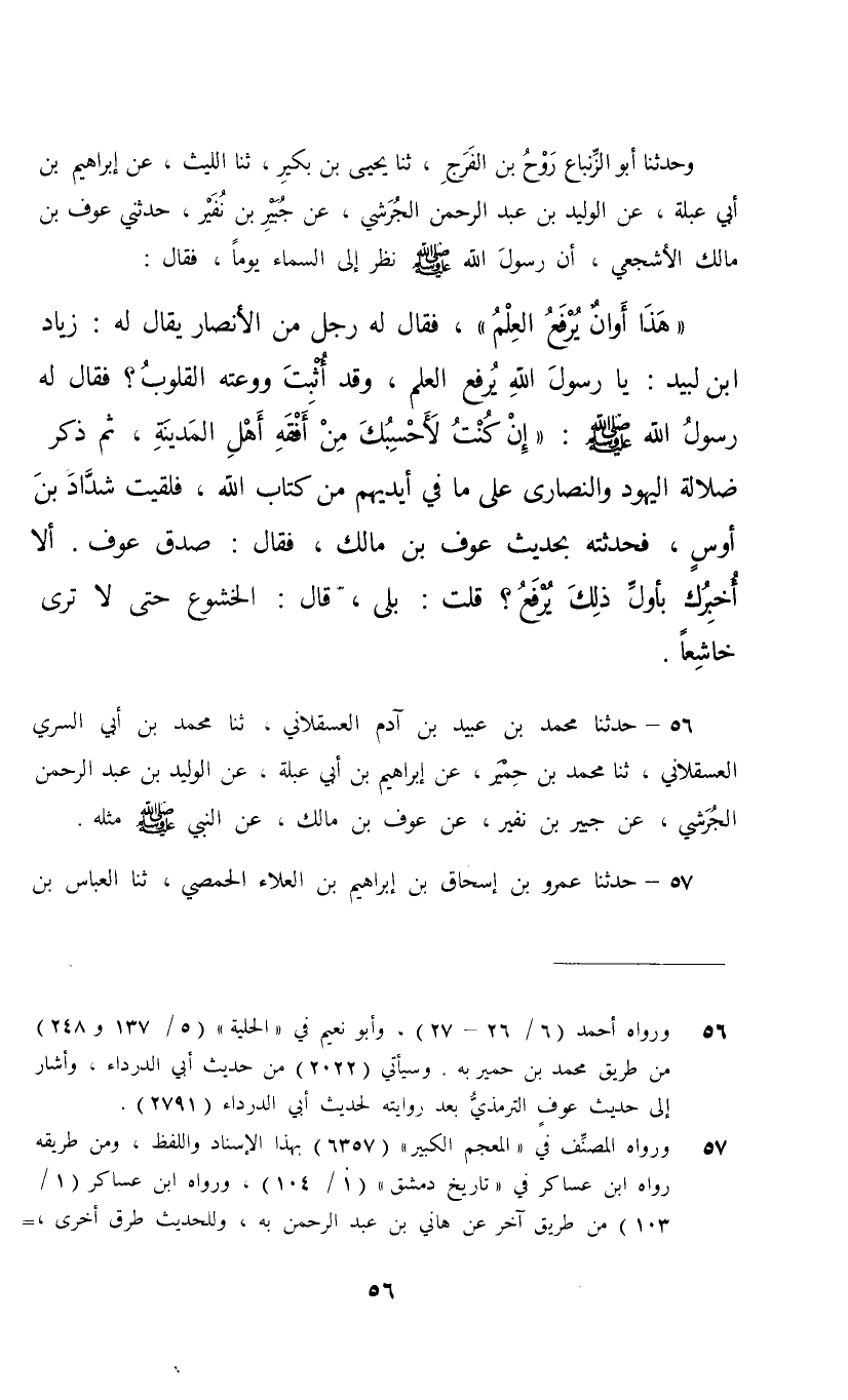 57 - حَدَّثَنَا عَمْرُو بْنُ إِسْحَاقَ بْنِ إِبْرَاهِيمَ بْنِ الْعَلَاءِ الْحِمْصِيُّ، ثنا الْعَبَّاسُ بْنُ إِسْمَاعِيلَ، ثنا هَانِئُ بْنُ عَبْدِ الرَّحْمَنِ بْنِ أَبِي عَبْلَةَ، ثنا عَمِّي، إِبْرَاهِيمُ بْنُ أَبِي عَبْلَةَ , عَنِ الْوَلِيدِ بْنِ عَبْدِ الرَّحْمَنِ الْجُرَشِيِّ، عَنْ جُبَيْرِ بْنِ نُفَيْرٍ، عَنْ سَلَمَةَ بْنِ نُفَيْلٍ، قَالَ: كُنْتُ جَالِسًا عِنْدَ النَّبِيِّ صَلَّى اللهُ عَلَيْهِ وَسَلَّمَ فَقَالَ: §«يُوحَى إِلَيَّ أَنِّي مَقْبُوضٌ غَيْرَ مُلَبَثٍ وَإِنَّكُمْ مُتَّبِعِيَّ أَفْنَادًا يَضْرِبُ بَعْضُكُمْ رِقَابَ بَعْضٍ , وَلَا يَزَالُ مِنْ أُمَّتِي نَاسٌ يُقَاتِلُونَ عَلَى الْحَقِّ وَيُزِيغُ اللَّهُ بِهِمْ قُلُوبَ أَقْوَامٍ وَيَرْزُقُهُمْ مِنْهُمْ حَتَّى تَقُومَ السَّاعَةُ وَحَتَّى يَأْتِيَ وَعَدُ اللَّهِ , وَالْخَيْلُ مَعْقُودٌ فِي نَوَاصِيهَا الْخَيْرُ إِلَى يَوْمِ الْقِيَامَةِ , وَعُقْرُ دَارِ الْمُؤْمِنِينَ بِالشَّامِ»