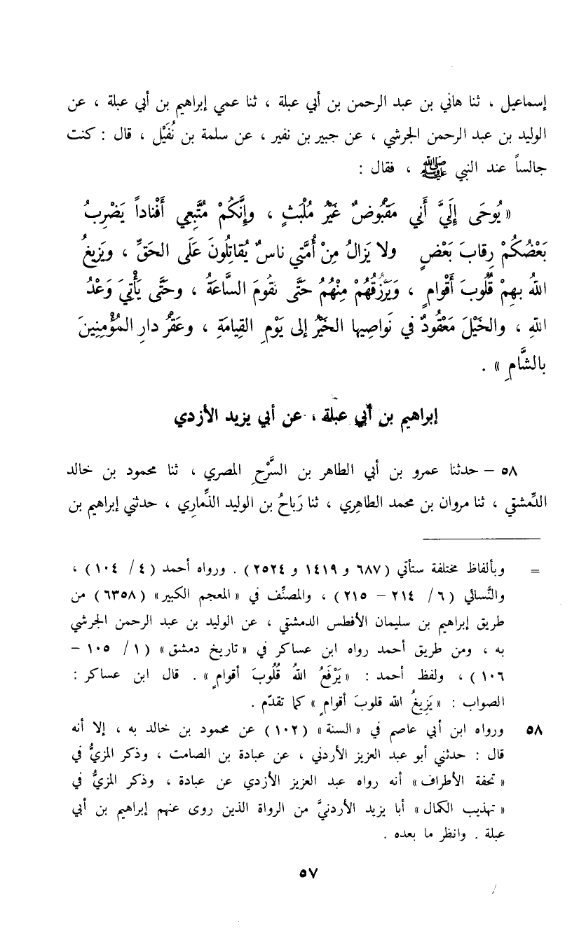 58 - حَدَّثَنَا عَمْرُو بْنُ أَبِي الطَّاهِرِ بْنِ السَّرْحِ الْمِصْرِيُّ، ثنا مَحْمُودُ بْنُ خَالِدٍ الدِّمَشْقِيُّ، ثنا مَرْوَانُ بْنُ مُحَمَّدٍ الْطَاهِرِيُّ، ثنا رَبَاحُ بْنُ الْوَلِيدِ الذِّمَارِيُّ، حَدَّثَنِي إِبْرَاهِيمُ بْنُ أَبِي عَبْلَةَ، عَنْ أَبِي يَزِيدَ الْأَزْدِيِّ، عَنْ عُبَادَةَ بْنِ الصَّامِتِ، قَالَ: سَمِعْتُ رَسُولَ اللَّهِ صَلَّى اللهُ عَلَيْهِ وَسَلَّمَ يَقُولُ: إِنَّ §أَوَّلَ مَا خَلَقَ اللَّهُ الْقَلَمُ , فَقَالَ لَهُ اكْتُبْ قَالَ: يَا رَبِّ مَا أَكْتُبُ؟ قَالَ «اكْتُبْ مَقَادِيرَ كُلِّ شَيْءٍ»