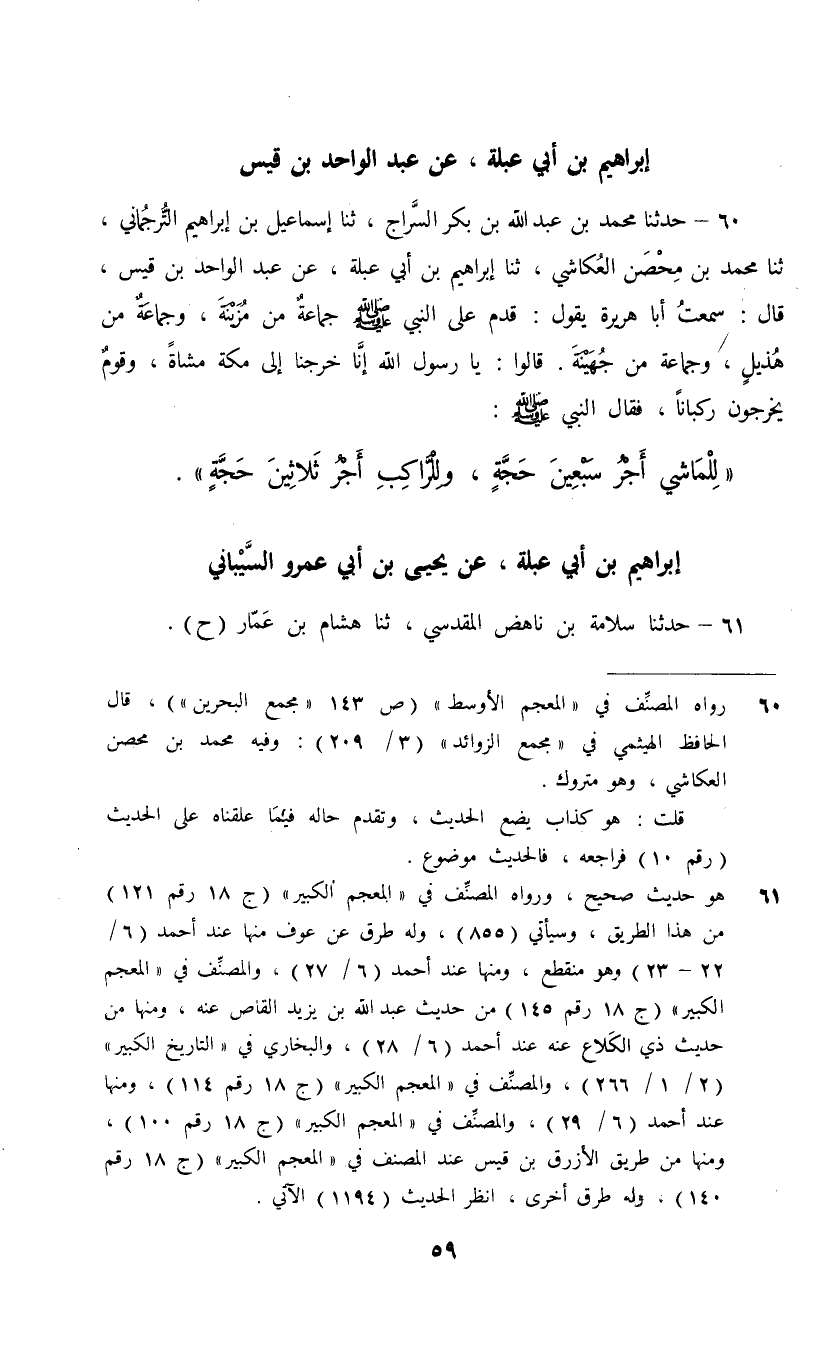 60 - حَدَّثَنَا مُحَمَّدُ بْنُ عَبْدِ اللَّهِ بْنِ بَكْرٍ السَّرَّاجُ، ثنا إِسْمَاعِيلُ بْنُ إِبْرَاهِيمَ التَّرْجُمَانِيُّ، ثنا مُحَمَّدُ بْنُ مِحْصَنٍ الْعُكَّاشِيُّ، ثنا إِبْرَاهِيمُ بْنُ أَبِي عَبْلَةَ، عَنْ عَبْدِ الْوَاحِدِ بْنِ قَيْسٍ، قَالَ: سَمِعْتُ أَبَا هُرَيْرَةَ، يَقُولُ قَدِمَ عَلَى النَّبِيِّ صَلَّى اللهُ عَلَيْهِ وَسَلَّمَ جَمَاعَةٌ مِنْ مُزَيْنَةَ , وَجَمَاعَةٌ مِنْ هُذَيْلٍ وَجَمَاعَةٌ مِنْ جُهَيْنَةَ , قَالُوا: يَا رَسُولَ اللَّهِ إِنَّا خَرَجْنَا إِلَى مَكَّةَ مُشَاةً , وَقَوْمٌ يَخْرُجُونَ رُكْبَانًا , فَقَالَ النَّبِيُّ صَلَّى اللهُ عَلَيْهِ وَسَلَّمَ: §لِلْمَاشِي أَجْرُ سَبْعِينَ حَجَّةً , وَلِلرَّاكِبِ أَجْرُ ثَلَاثِينَ حَجَّةً "