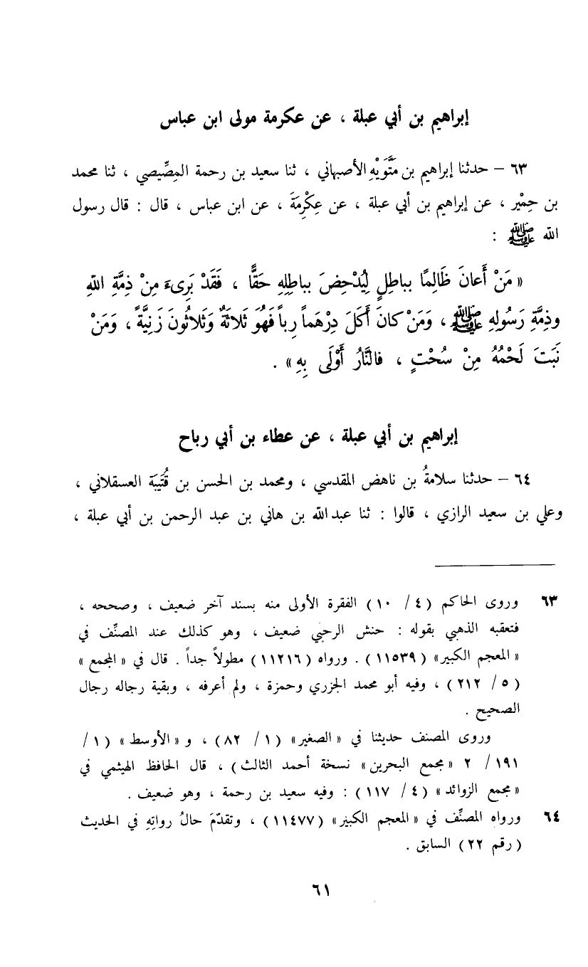 63 - حَدَّثَنَا إِبْرَاهِيمُ بْنُ مَتَّوَيْهٍ الْأَصْبَهَانِيُّ، ثنا سَعِيدُ بْنُ رَحْمَةَ الْمِصِّيصِيُّ، ثنا مُحَمَّدُ بْنُ حِمْيَرٍ، عَنْ إِبْرَاهِيمَ بْنِ أَبِي عَبْلَةَ، عَنْ عِكْرِمَةَ، عَنِ ابْنِ عَبَّاسٍ، قَالَ: قَالَ رَسُولُ اللَّهِ صَلَّى اللهُ عَلَيْهِ وَسَلَّمَ: §«مَنْ أَعَانَ ظَالِمًا بِبَاطِلٍ لِيَدْحَضَ بِبَاطِلِهِ حَقًّا فَقَدْ بَرِئَ مِنْ ذِمَّةَ اللَّهِ وَذِمَّةِ رَسُولِهِ صَلَّى اللهُ عَلَيْهِ وَسَلَّمَ , وَمَنْ كَانَ أَكَلَ دِرْهَمًا رِبًا فَهُوَ ثَلَاثَةٌ وَثَلَاثُونَ زَنْيَةً , وَمَنْ نَبَتَ لَحْمُهُ مِنْ سُحْتٍ فَالنَّارُ أَوْلَى بِهِ»