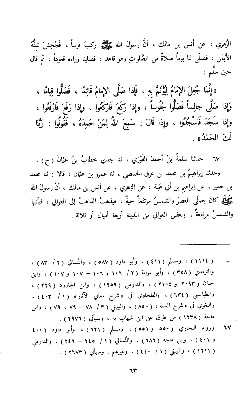 67 - حَدَّثَنَا سَلَمَةُ بْنُ أَحْمَدَ الْفَوْزِيُّ، ثنا جَدِّي، خَطَّابُ بْنُ عُثْمَانَ ح وَحَدَّثَنَا إِبْرَاهِيمُ بْنُ مُحَمَّدِ بْنِ عِرْقٍ الْحِمْصِيُّ، ثنا عَمْرُو بْنُ عُثْمَانَ، قَالَا: ثنا مُحَمَّدُ بْنُ حِمْيَرٍ، عَنْ إِبْرَاهِيمَ بْنِ أَبِي عَبْلَةَ، عَنِ الزُّهْرِيِّ، عَنْ أَنَسِ بْنِ مَالِكٍ، أَنَّ رَسُولَ اللَّهِ صَلَّى اللهُ عَلَيْهِ وَسَلَّمَ كَانَ §يُصَلِّي الْعَصْرَ وَالشَّمْسُ مُرْتَفِعَةٌ حَيَّةٌ فَيَذْهَبُ الذَّاهِبُ إِلَى الْعَوَالِي فَيَأْتِيهَا وَالشَّمْسُ مُرْتَفِعَةٌ وَبَعْضُ الْعَوَالِي مِنَ الْمَدِينَةِ أَرْبَعَةُ أَمْيَالٍ أَوْ ثَلَاثَةٌ