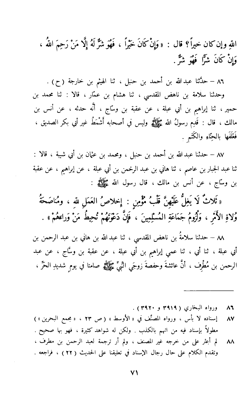 87 - حَدَّثَنَا عَبْدُ اللَّهِ بْنُ أَحْمَدَ بْنِ حَنْبَلٍ، وَمُحَمَّدُ بْنُ عُثْمَانَ بْنِ أَبِي شَبِيةَ , قَالَا: ثنا عَبْدُ الْجَبَّارِ بْنُ عَاصِمٍ، ثنا هَانِي بْنُ عَبْدِ الرَّحْمَنِ بْنِ أَبِي عَبْلَةَ، عَنْ إِبْرَاهِيمَ، عَنْ عُقْبَةَ بْنِ وَسَّاجٍ، عَنْ أَنَسِ بْنِ مَالِكٍ، قَالَ رَسُولُ اللَّهِ صَلَّى اللهُ عَلَيْهِ وَسَلَّمَ: " §ثَلَاثٌ لَا يَغِلُّ عَلَيْهِنَّ قَلْبُ مُؤْمِنٍ: إِخْلَاصُ الْعَمَلِ لِلَّهِ , وَمُنَاصَحَةُ وُلَاةِ الْأَمْرِ , وَلُزُومِ جَمَاعَةِ الْمُسْلِمِينَ , فَإِنَّ دَعْوَتَهُمْ تُحِيطُ مَنْ وَرَاءَهُمْ