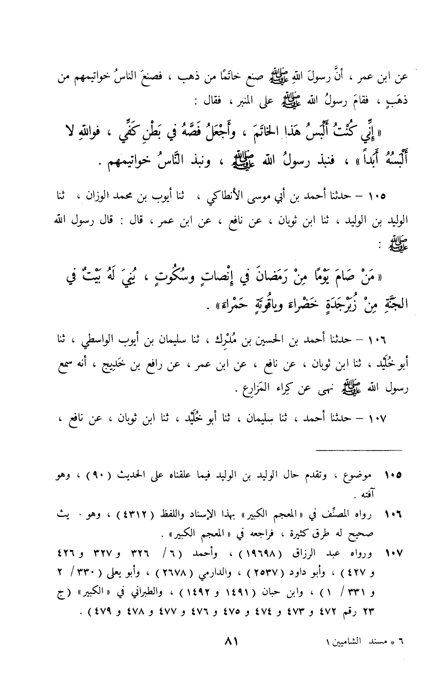 105 - حَدَّثَنَا أَحْمَدُ بْنُ أَبِي مُوسَى الْأَنْطَاكِيُّ، ثنا أَيُّوبُ بْنُ مُحَمَّدٍ الْوَزَّانُ، ثنا الْوَلِيدُ بْنُ الْوَلِيدِ، ثنا ابْنُ ثَوْبَانَ، عَنْ نَافِعٍ، عَنِ ابْنِ عُمَرَ، قَالَ: قَالَ رَسُولُ اللَّهِ صَلَّى اللهُ عَلَيْهِ وَسَلَّمَ: §«مَنْ صَامَ يَوْمًا مِنْ رَمَضَانَ فِي إِنْصَاتٍ وَسُكُوتٍ بُنِيَ لَهُ بَيْتٌ فِي الْجَنَّةِ مِنْ زَبَرْجَدَةٍ خَضْرَاءَ وَيَاقُوتَةٍ حَمْرَاءَ»