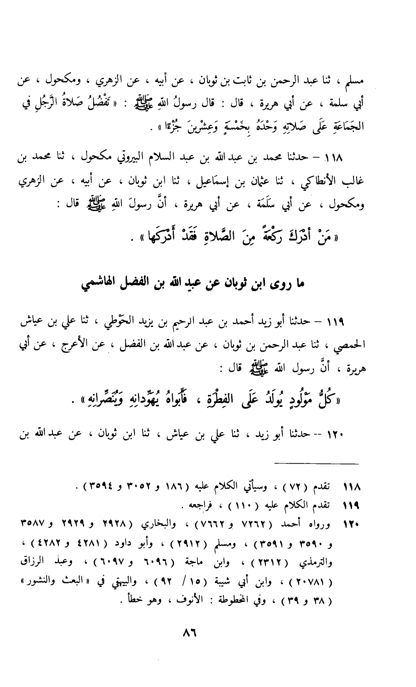 119 - حَدَّثَنَا أَبُو زَيْدٍ أَحْمَدُ بْنُ عَبْدِ الرَّحِيمِ بْنِ يَزِيدَ الْحَوْطِيُّ , ثنا عَلِيُّ بْنُ عَيَّاشٍ الْحِمْصِيُّ، ثنا عَبْدُ الرَّحْمَنِ بْنُ ثَوْبَانَ، عَنْ عَبْدِ اللَّهِ بْنِ الْفَضْلِ، عَنِ الْأَعْرَجِ، عَنْ أَبِي هُرَيْرَةَ، أَنَّ رَسُولَ اللَّهِ صَلَّى اللهُ عَلَيْهِ وَسَلَّمَ قَالَ: §«كُلُّ مَوْلُودٍ يُولَدُ عَلَى الْفِطْرَةِ فَأَبَوَاهُ يُهَوِّدَانِهِ وَيُنَصِّرَانِهِ»