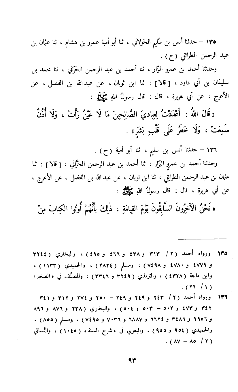 135 - حَدَّثَنَا أَنَسُ بْنُ سُلَيْمٍ الْخَوْلَانِيُّ، ثنا أَبُو أُمَيَّةَ عَمْرُو بْنُ هِشَامٍ , ثنا عُثْمَانُ بْنُ عَبْدِ الرَّحْمَنِ الطَّرَائِفِيُّ، ح , وَحَدَّثَنَا أَحْمَدُ بْنُ عَمْرٍو الْبَزَّارُ، ثنا أَحْمَدُ بْنُ عَبْدِ الرَّحْمَنِ الْحَرَّانِيُّ، ثنا مُحَمَّدُ بْنُ سُلَيْمَانَ بْنِ أَبِي دَاوُدَ، [قَالَا] : ثنا ابْنُ ثَوْبَانَ، عَنْ عَبْدِ اللَّهِ بْنِ الْفَضْلِ، عَنِ الْأَعْرَجِ، عَنْ أَبِي هُرَيْرَةَ، قَالَ: قَالَ رَسُولُ اللَّهِ صَلَّى اللهُ عَلَيْهِ وَسَلَّمَ: " قَالَ اللَّهُ: §«أَعْدَدْتُ لِعِبَادِي الصَّالِحِينَ مَا لَا عَيْنٌ رَأَتْ , وَلَا أَذُنٌ سَمِعَتْ وَلَا خَطَرَ عَلَى قَلْبِ بَشَرٍ»