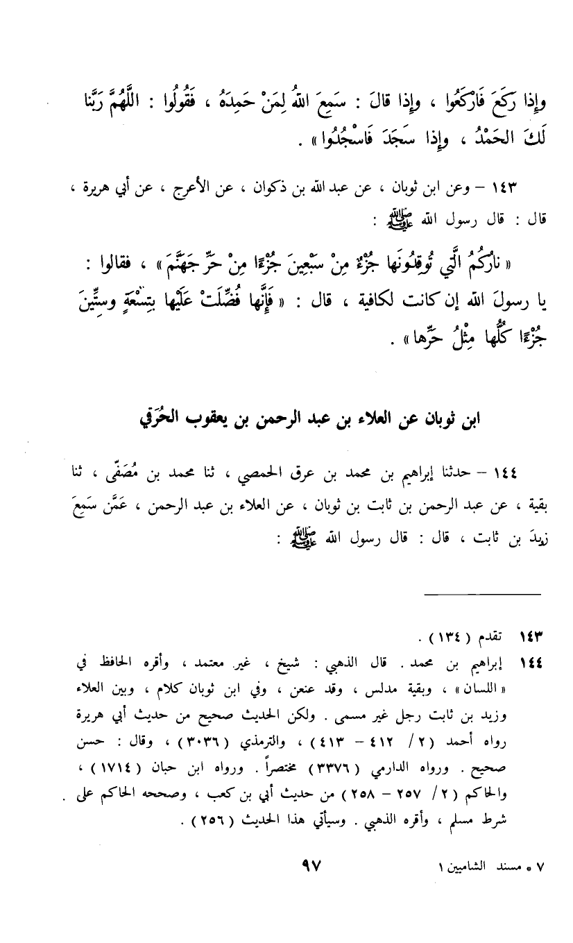 144 - حَدَّثَنَا إِبْرَاهِيمُ بْنُ مُحَمَّدِ بْنِ عِرْقٍ الْحِمْصِيُّ، ثنا مُحَمَّدُ بْنُ مُصَفًّى، ثنا بَقِيَّةُ، عَنْ عَبْدِ الرَّحْمَنِ بْنِ ثَابِتِ بْنِ ثَوْبَانَ، عَنِ الْعَلَاءِ بْنِ عَبْدِ الرَّحْمَنِ، عَمَّنْ سَمِعَ زَيْدَ بْنَ ثَابِتٍ، قَالَ: قَالَ رَسُولُ اللَّهِ صَلَّى اللهُ عَلَيْهِ وَسَلَّمَ: «وَالَّذِي نَفْسِي بِيَدِهِ §مَا أُنْزِلَ فِي التَّوْرَاةِ وَالْإِنْجِيلِ وَالزَّبُورِ وَالْفُرْقَانِ مِثْلُهَا وَهِيَ السَّبْعُ الْمَثَانِي يَعْنِي فَاتِحَةَ الْكِتَابِ»