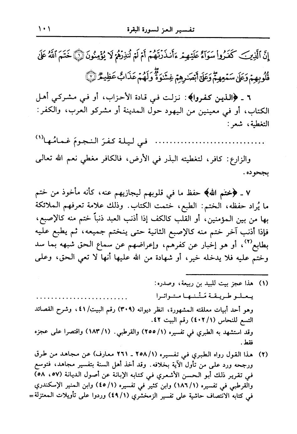 6 - {الَّذِينَ كَفَرُواْ} ! : نزلت في قادة الأحزاب، أو في مشركي أهل الكتاب، أو في معينين من اليهود حول المدينة أو مشركو العرب، والكفر: التغطية، شعر: